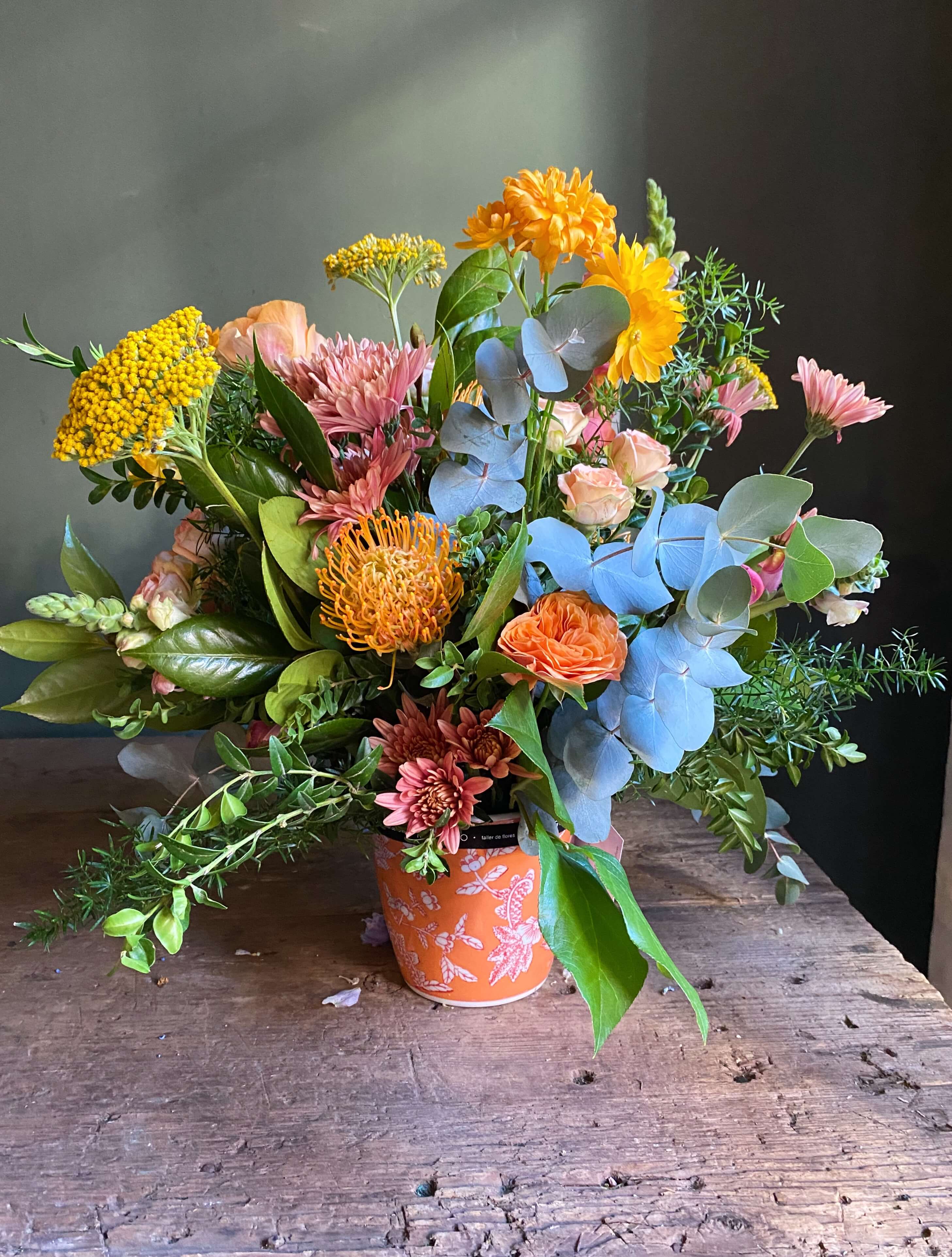 Esta foto es orientativa en cuanto a flores y color. Todos nuestro arreglos se hacen con flor de temporada y dependemos de la disponibilidad del mercado holandés del momento. Cada una de nuestras creaciones es única por lo que la foto es uno de los muchos arreglos que hemos hecho en este tipo de recipiente.