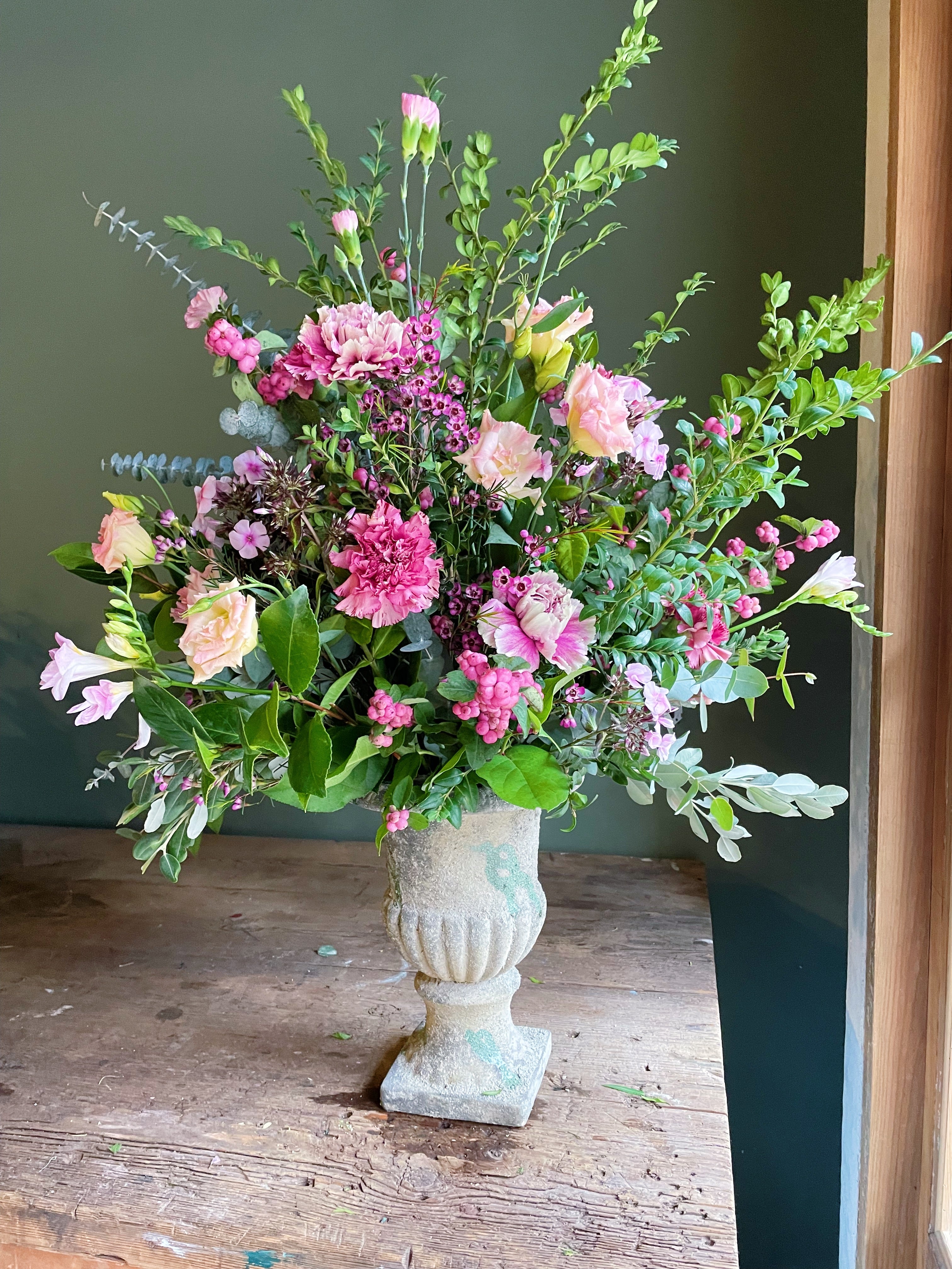 Todos nuestro arreglos se hacen con flor de temporada y dependemos de la disponibilidad del mercado holandés del momento. Cada una de nuestras creaciones es única por lo que la foto es uno de los muchos arreglos que hemos hecho en este tipo de recipiente.