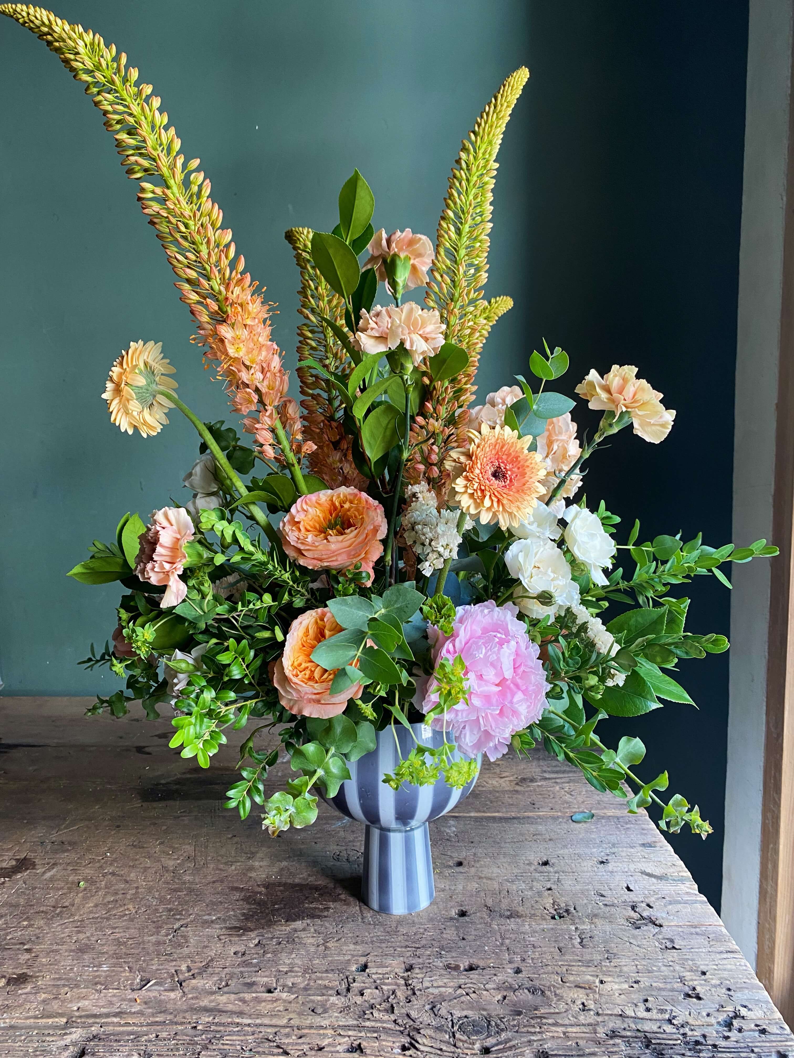 Esta foto es orientativa en cuanto a flores y color. Todos nuestro arreglos se hacen con flor de temporada y dependemos de la disponibilidad del mercado holandés del momento. Cada una de nuestras creaciones es única por lo que la foto es uno de los muchos arreglos que hemos hecho en este tipo de recipiente.