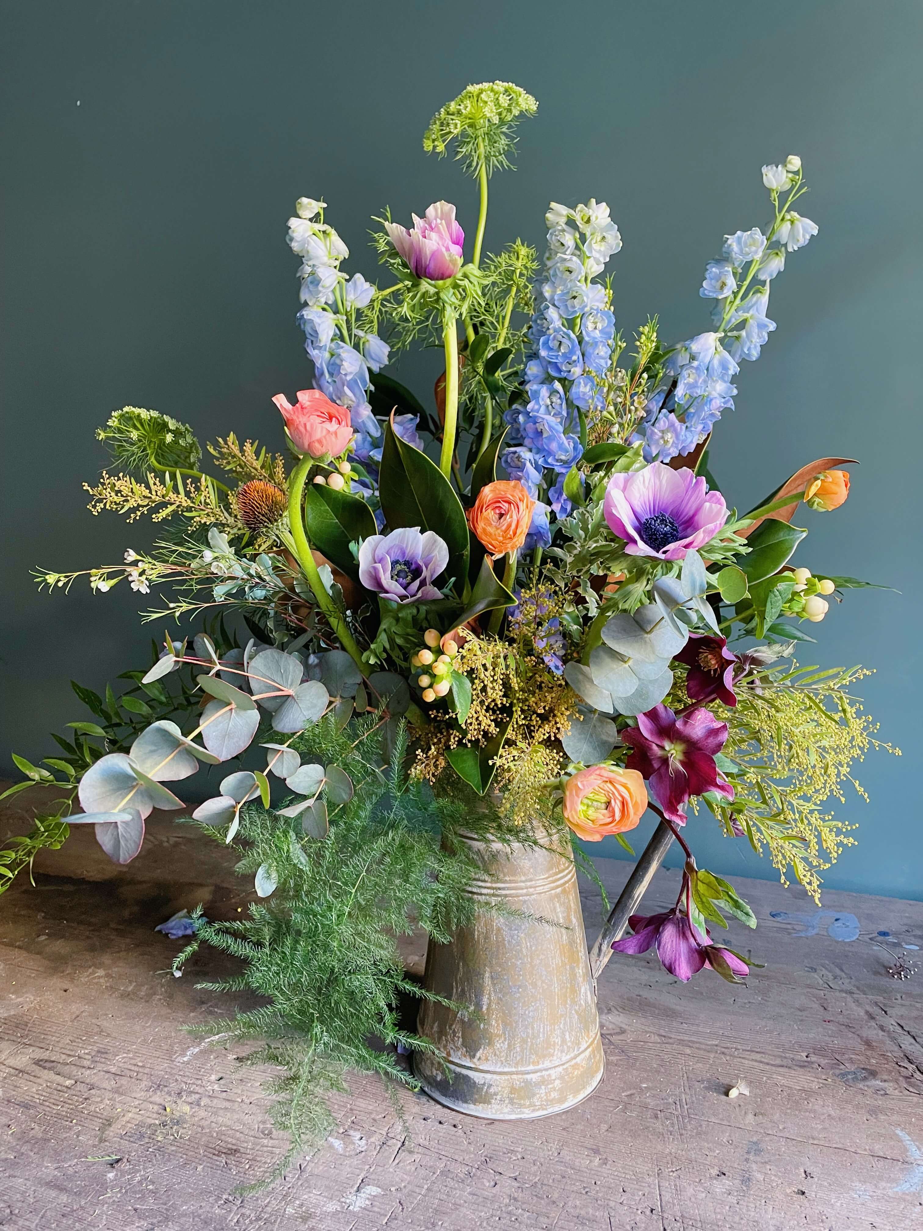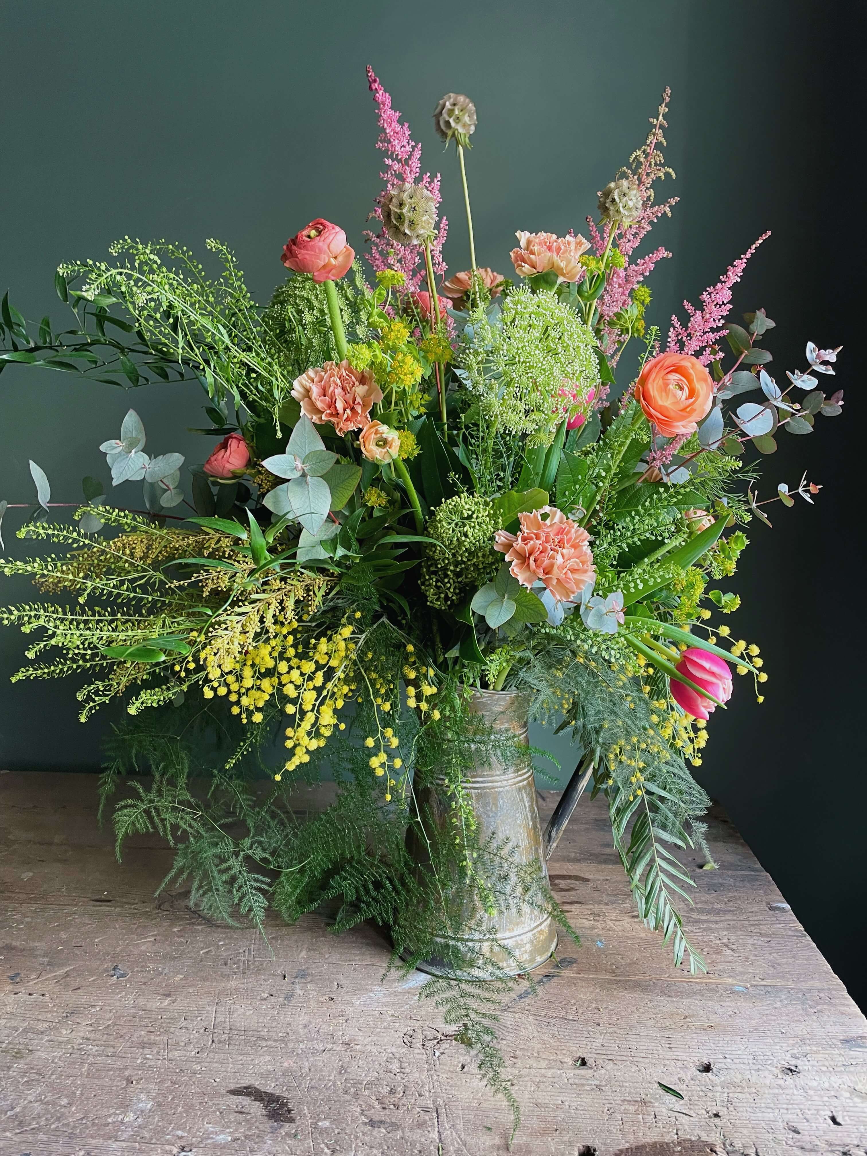 Esta foto es orientativa en cuanto a flores y color. Todos nuestro arreglos se hacen con flor de temporada y dependemos de la disponibilidad del mercado holandés del momento. Cada una de nuestras creaciones es única por lo que la foto es uno de los muchos arreglos que hemos hecho en este tipo de recipiente.