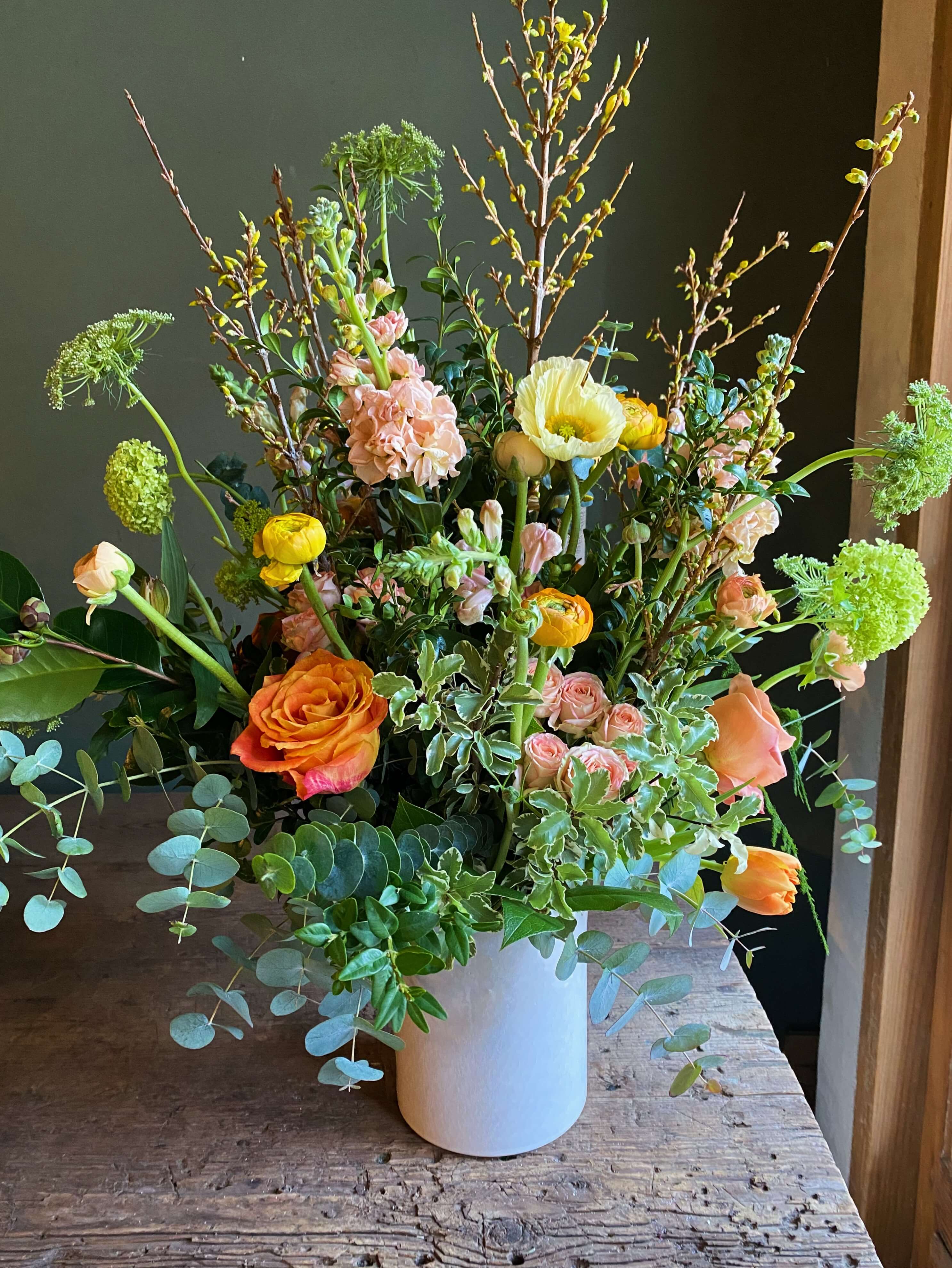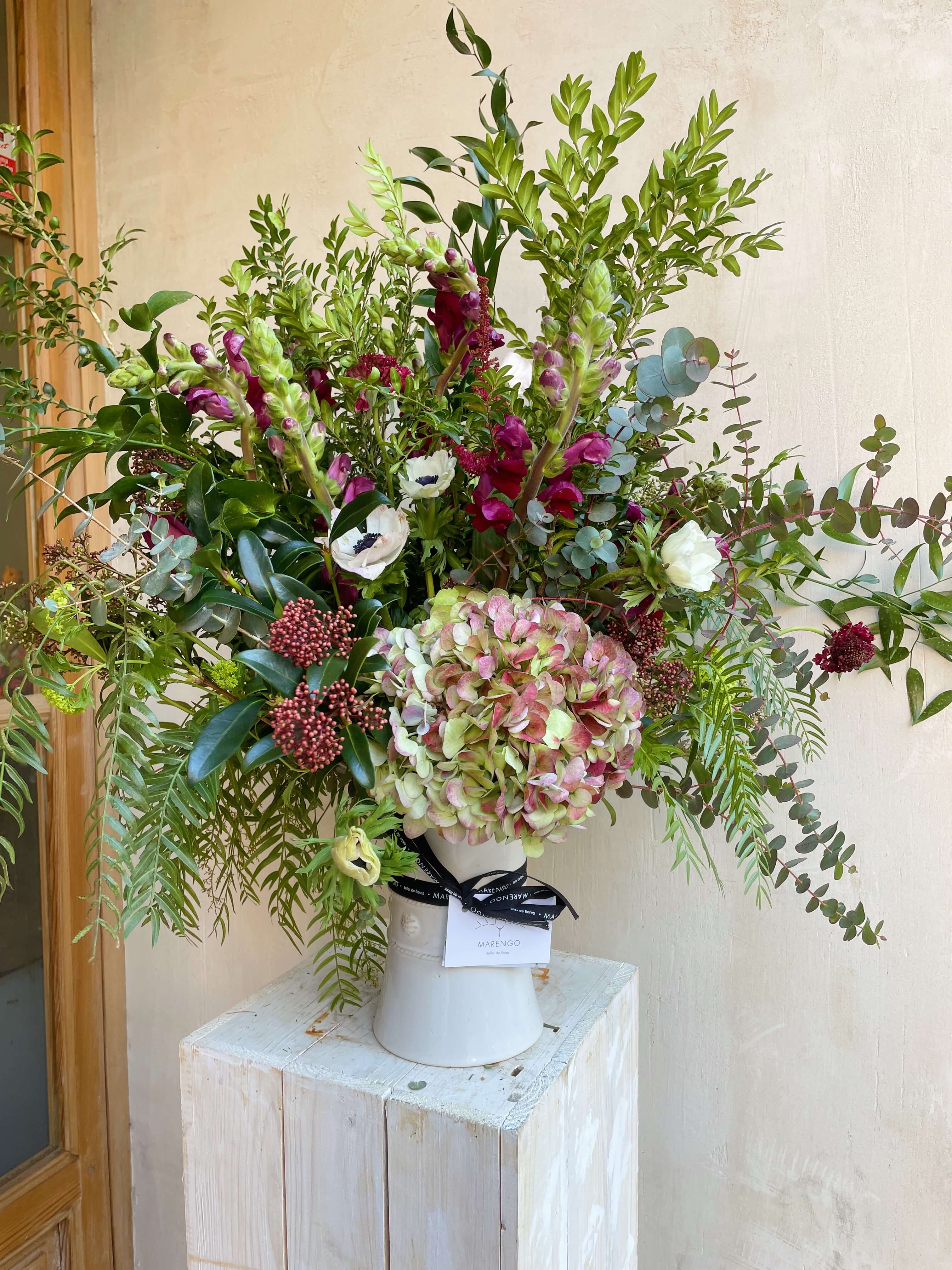 Esta foto es orientativa en cuanto a flores y color. Todos nuestro arreglos se hacen con flor de temporada y dependemos de la disponibilidad del mercado holandés del momento. Cada una de nuestras creaciones es única por lo que la foto es uno de los muchos arreglos que hemos hecho en este tipo de recipiente.