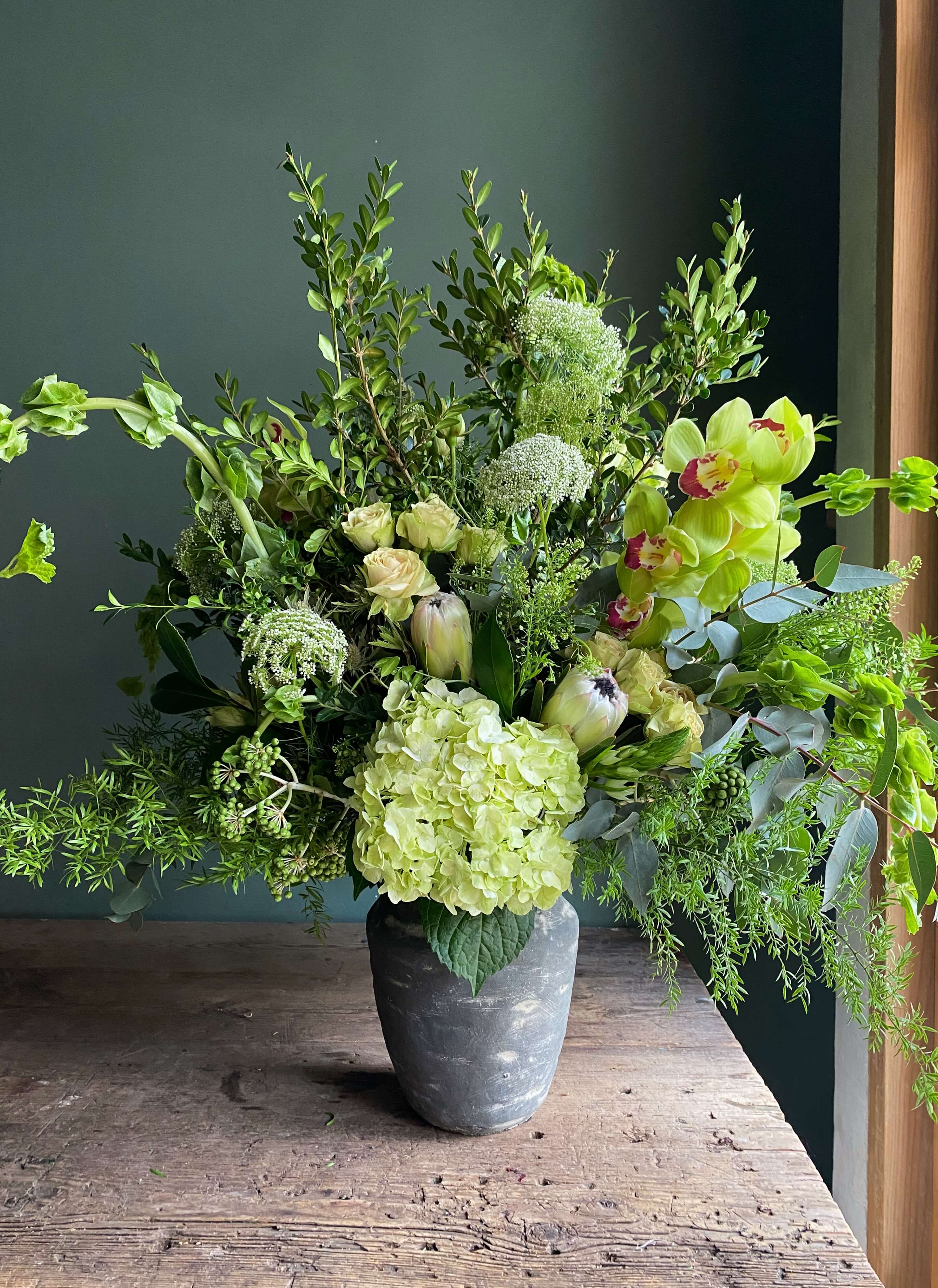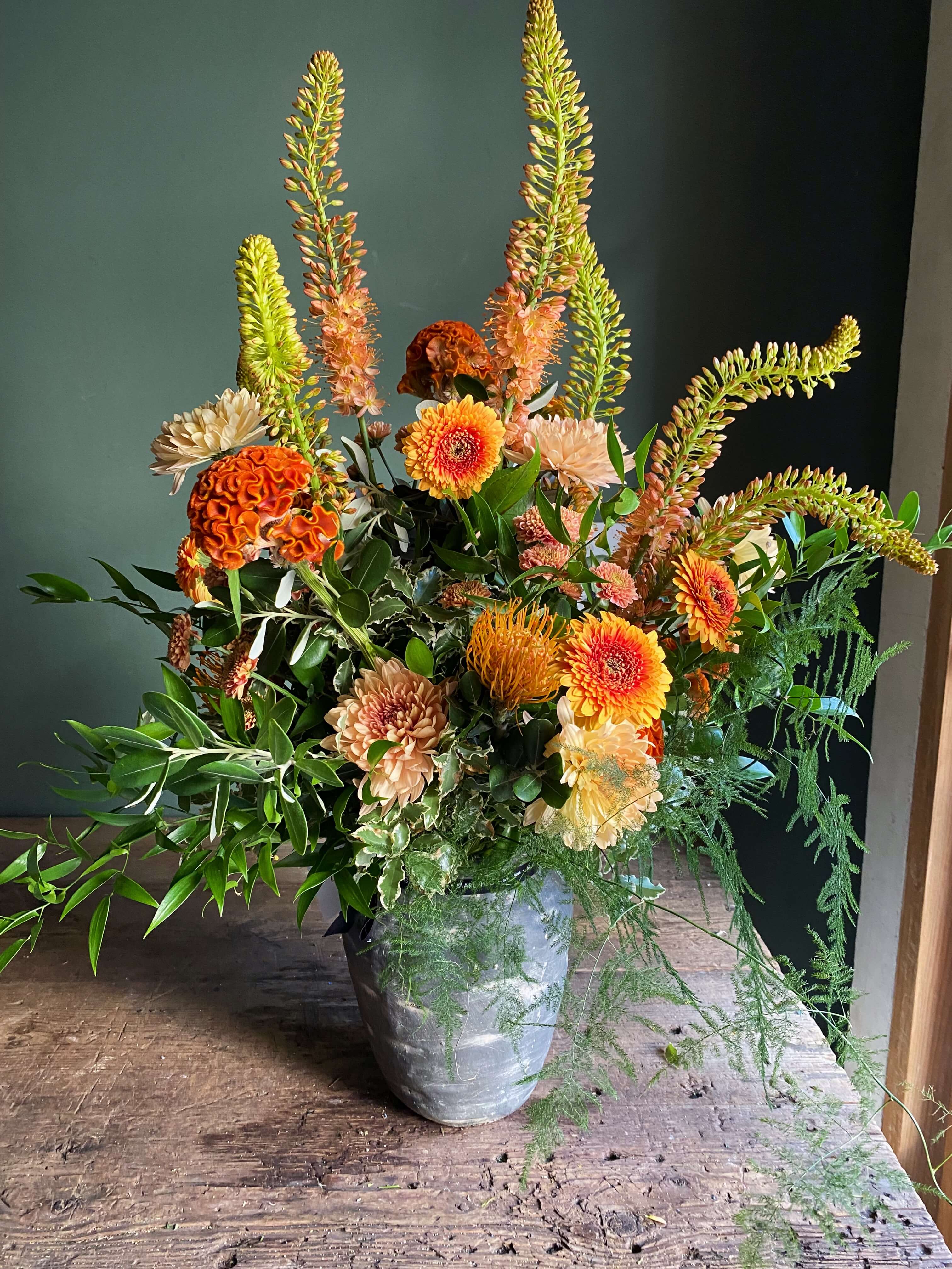 Todos nuestro arreglos se hacen con flor de temporada y dependemos de la disponibilidad del mercado holandés del momento. Cada una de nuestras creaciones es única por lo que la foto es uno de los muchos arreglos que hemos hecho en este tipo de recipiente.