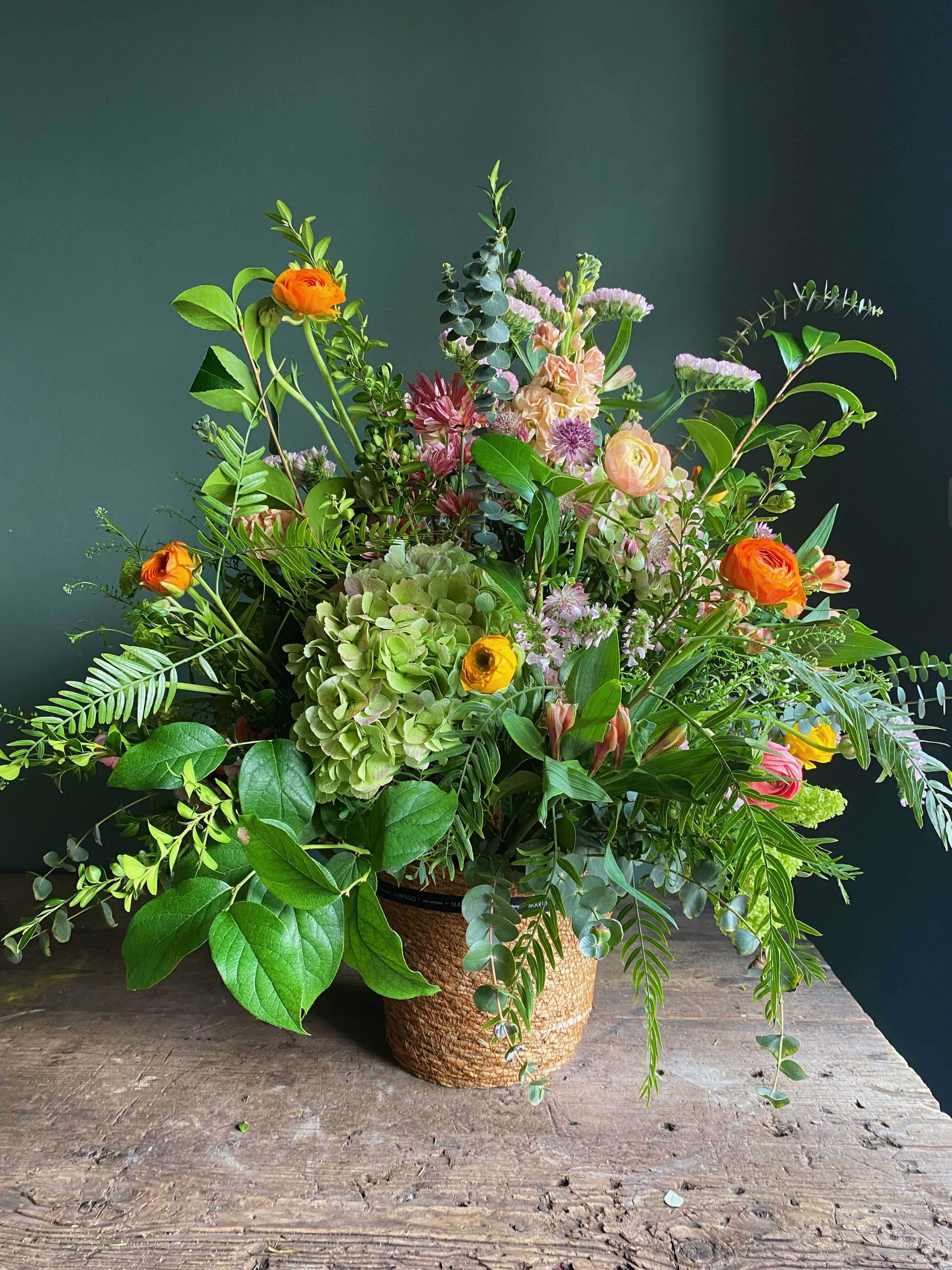 Esta foto es orientativa en cuanto a flores y color. Todos nuestro arreglos se hacen con flor de temporada y dependemos de la disponibilidad del mercado holandés del momento. Cada una de nuestras creaciones es única por lo que la foto es uno de los muchos arreglos que hemos hecho en este tipo de recipiente.