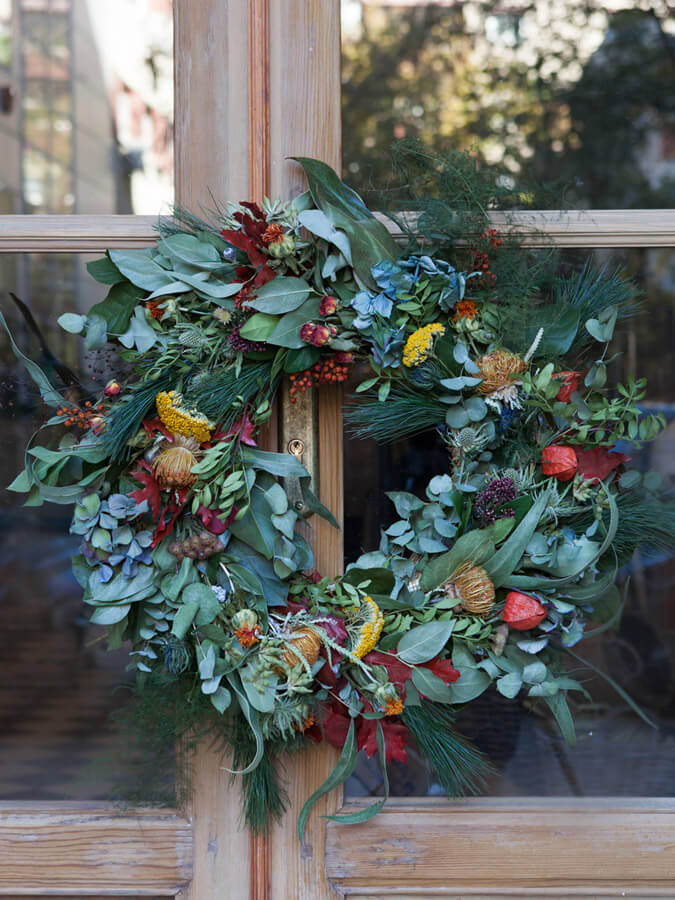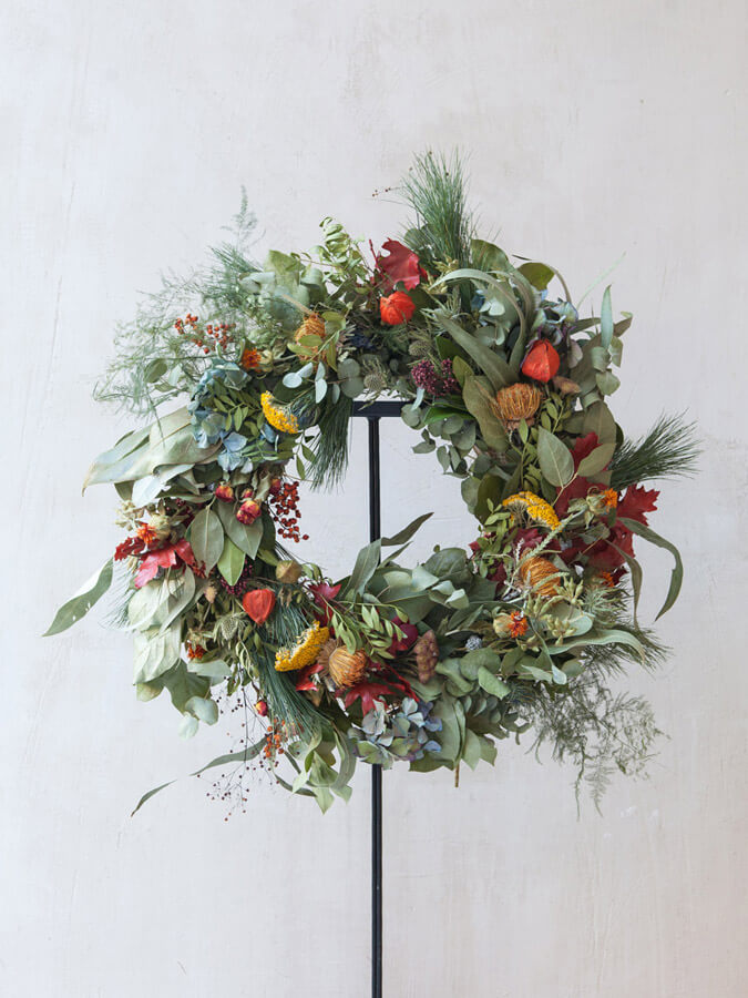 Corona decorativa con ramaje natural, hojas preservadas, flores secas y frutos.