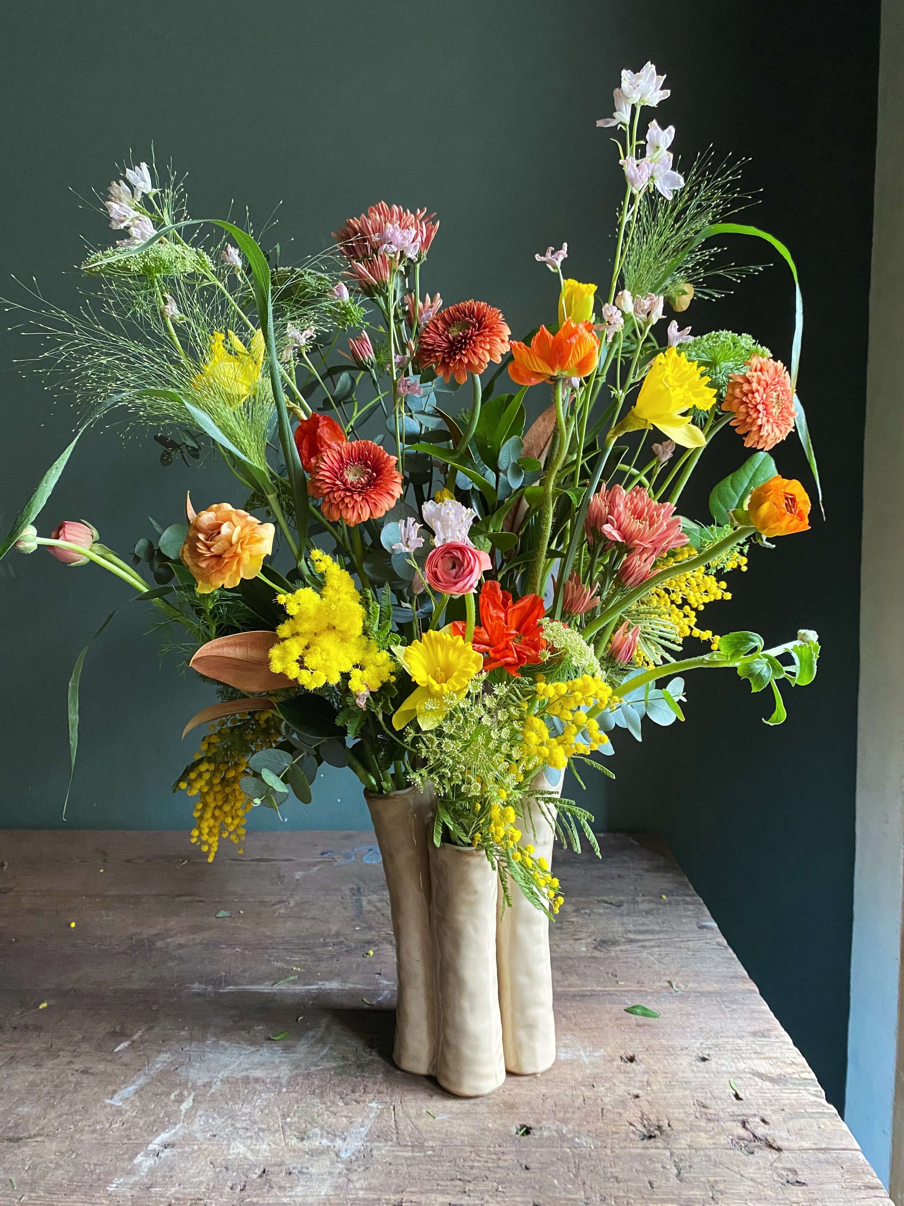 Esta foto es orientativa en cuanto a flores y color. Todos nuestro arreglos se hacen con flor de temporada y dependemos de la disponibilidad del mercado holandés del momento. Cada una de nuestras creaciones es única por lo que la foto es uno de los muchos arreglos que hemos hecho en este tipo de recipiente.