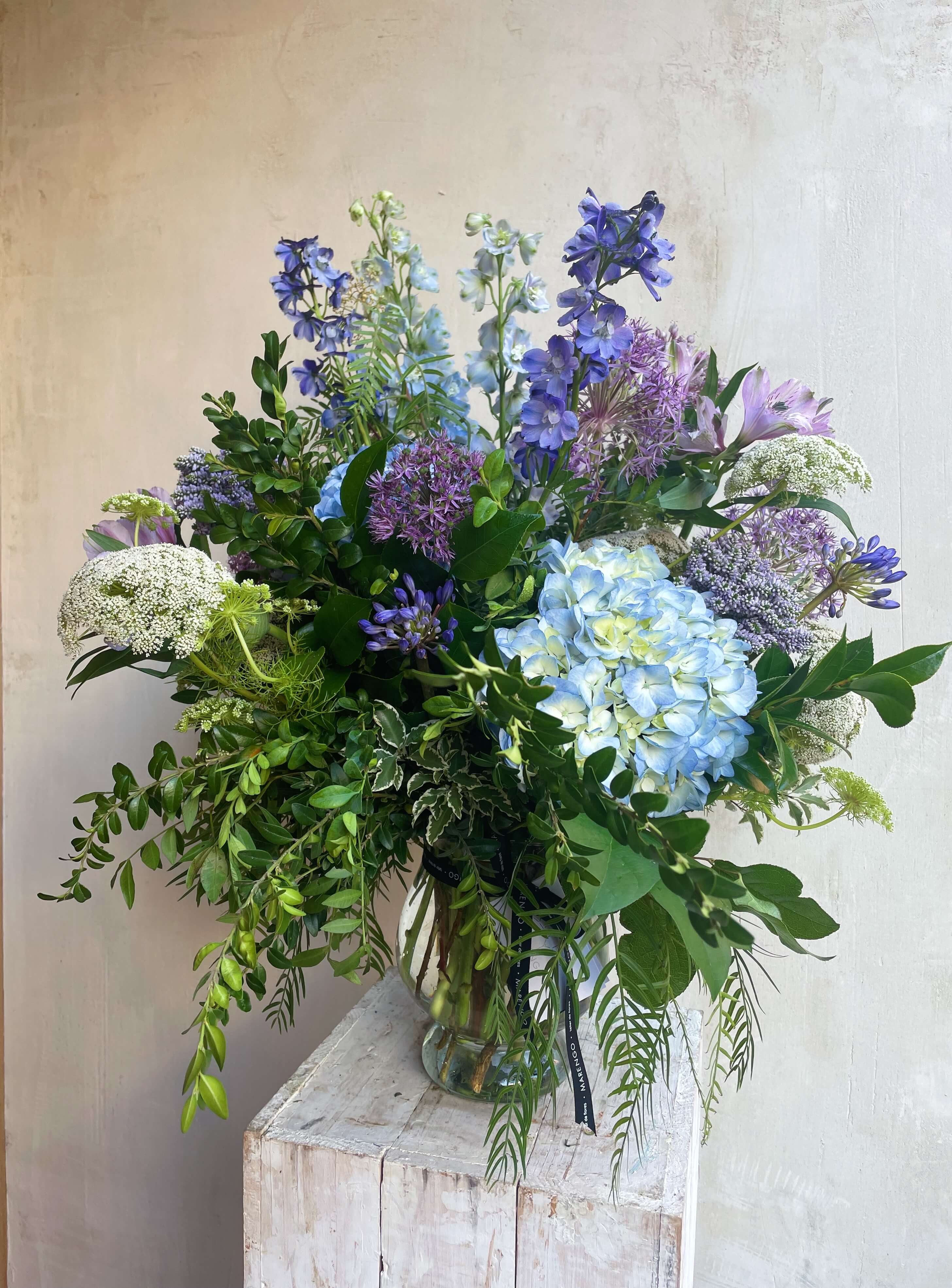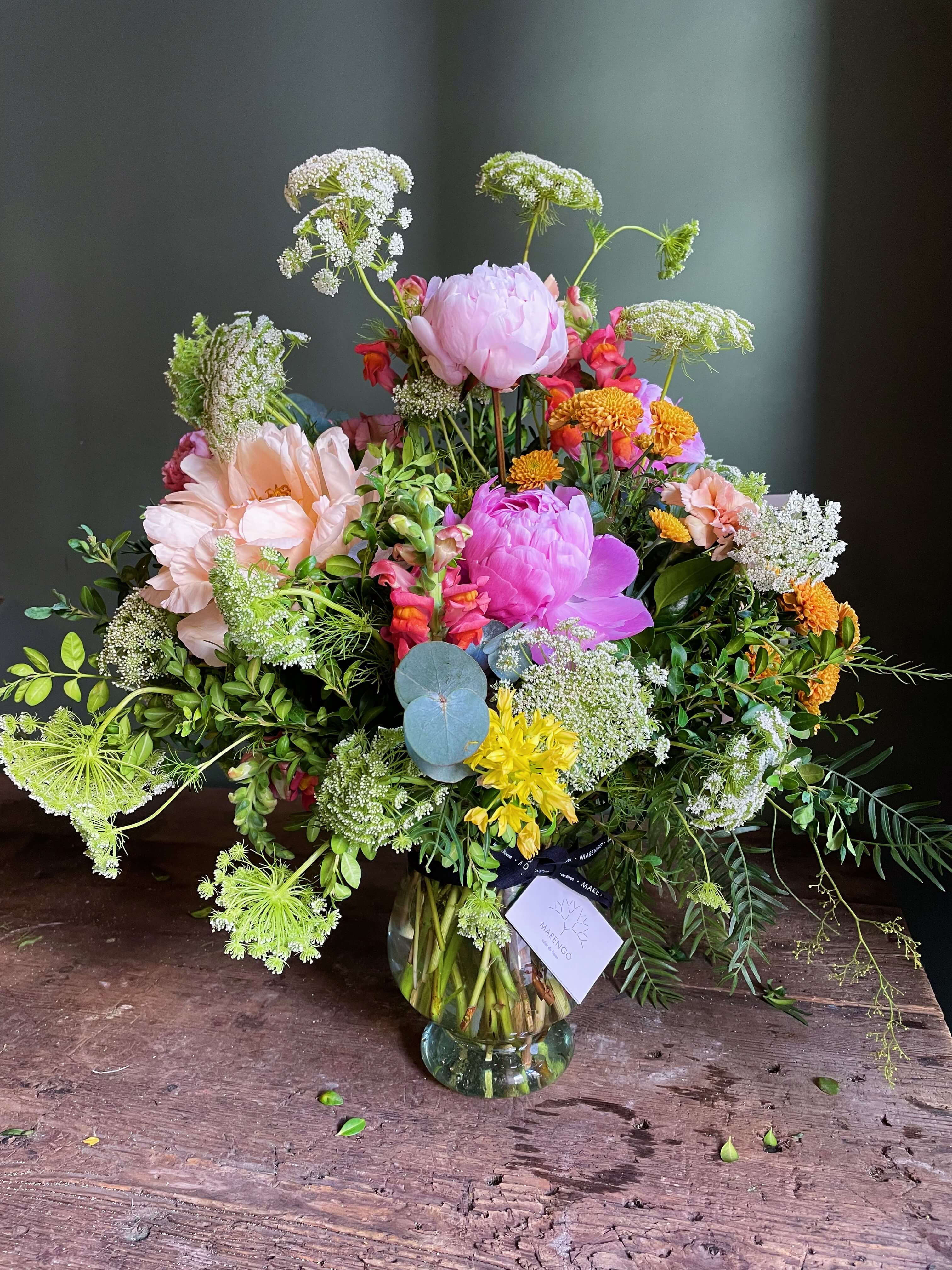 Esta foto es orientativa en cuanto a flores y color. Todos nuestro arreglos se hacen con flor de temporada y dependemos de la disponibilidad del mercado holandés del momento. Cada una de nuestras creaciones es única por lo que la foto es uno de los muchos arreglos que hemos hecho en este tipo de recipiente.