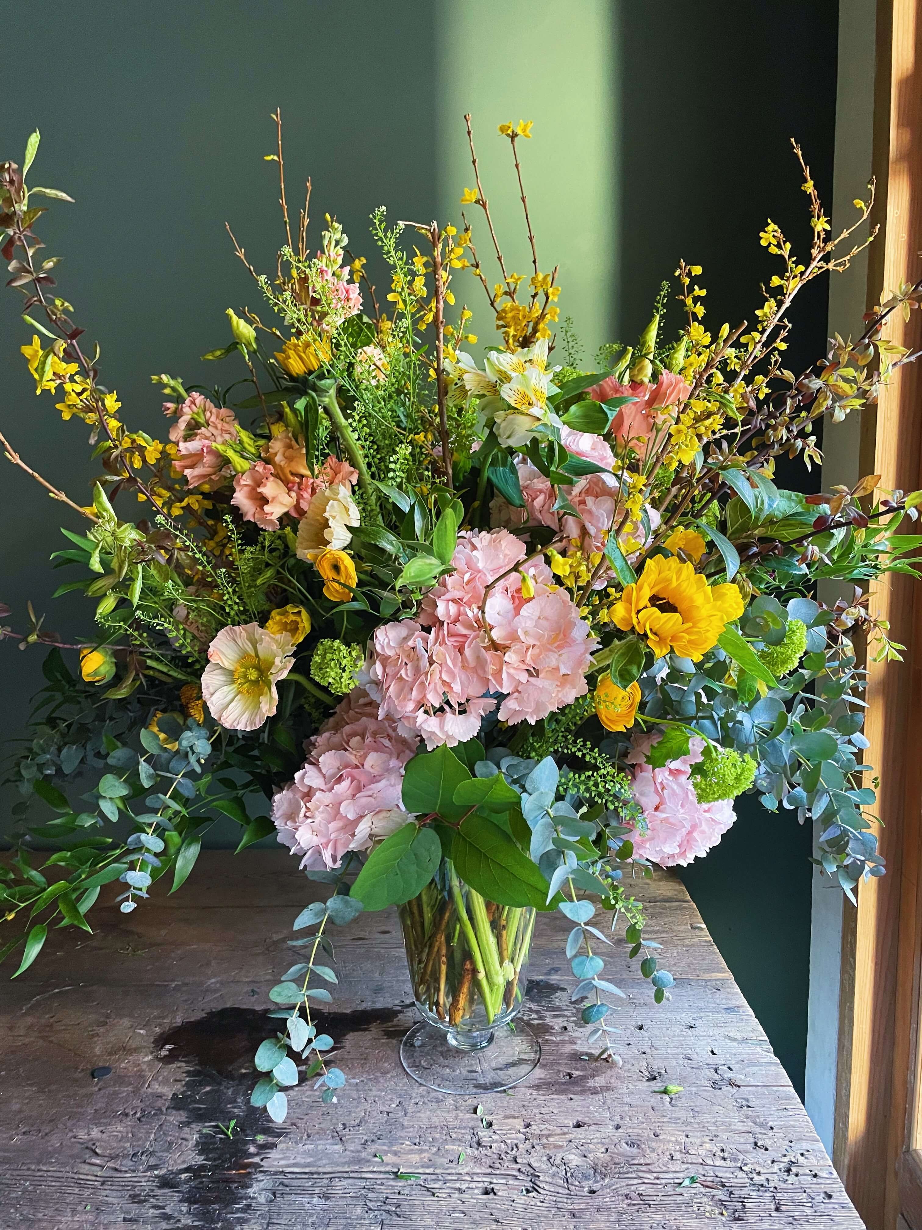 Esta foto es orientativa en cuanto a flores y color. Todos nuestro arreglos se hacen con flor de temporada y dependemos de la disponibilidad del mercado holandés del momento. Cada una de nuestras creaciones es única por lo que la foto es uno de los muchos arreglos que hemos hecho en este tipo de recipiente.