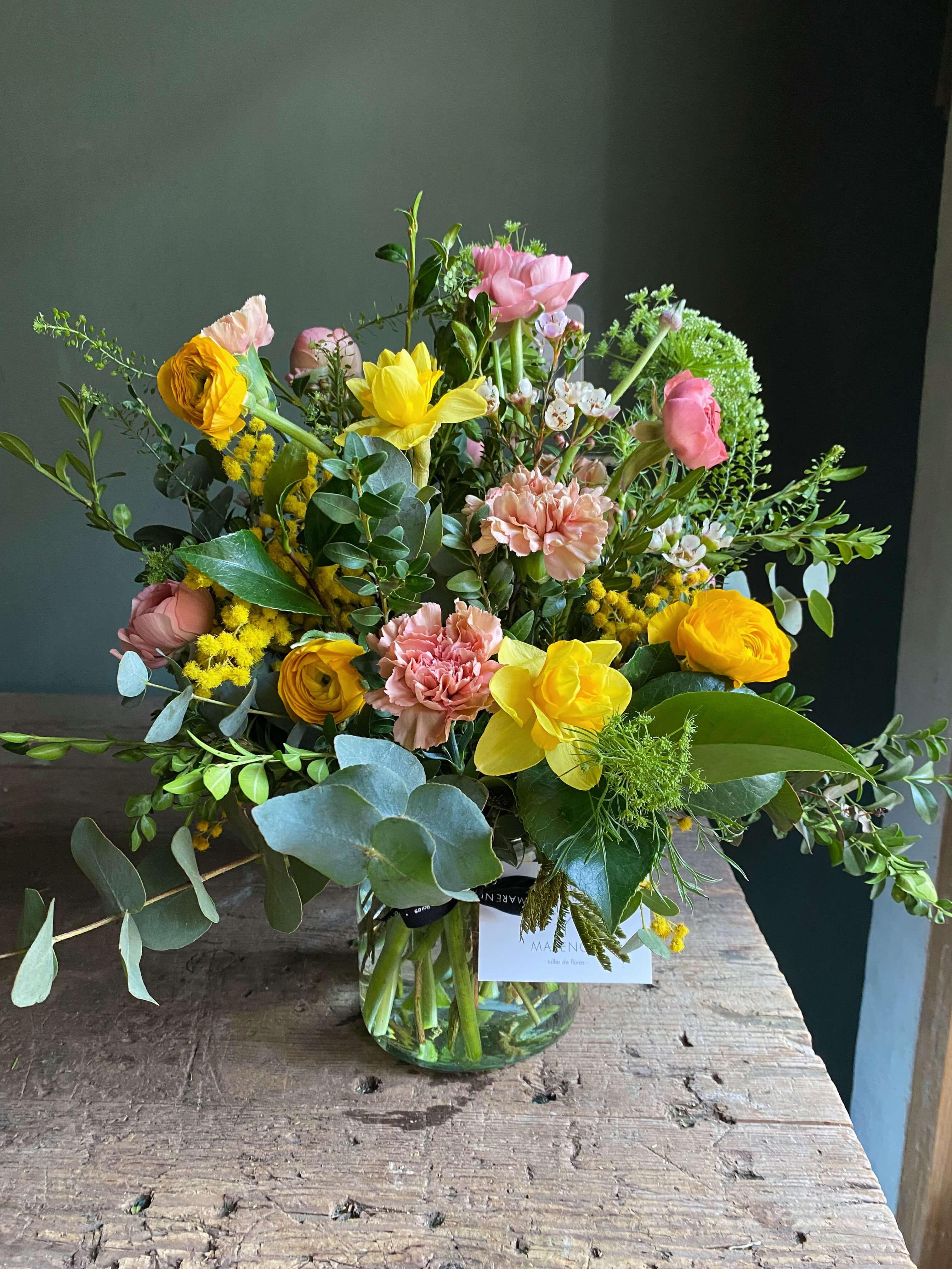 Esta foto es orientativa en cuanto a flores y color. Todos nuestro arreglos se hacen con flor de temporada y dependemos de la disponibilidad del mercado holandés del momento. Cada una de nuestras creaciones es única por lo que la foto es uno de los muchos arreglos que hemos hecho en este tipo de recipiente.