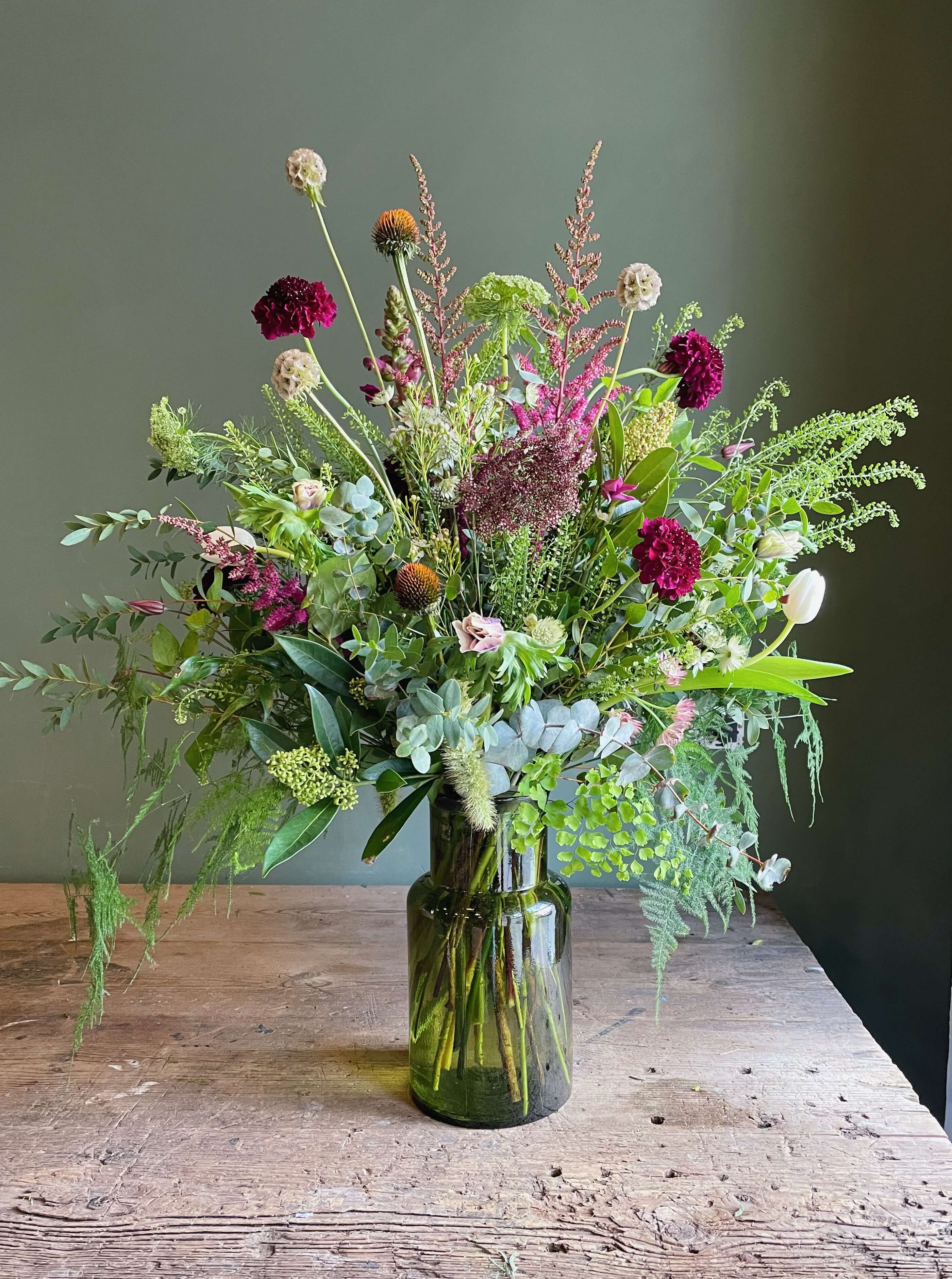 Esta foto es orientativa en cuanto a flores y color. Todos nuestro arreglos se hacen con flor de temporada y dependemos de la disponibilidad del mercado holandés del momento. Cada una de nuestras creaciones es única por lo que la foto es uno de los muchos arreglos que hemos hecho en este tipo de recipiente.