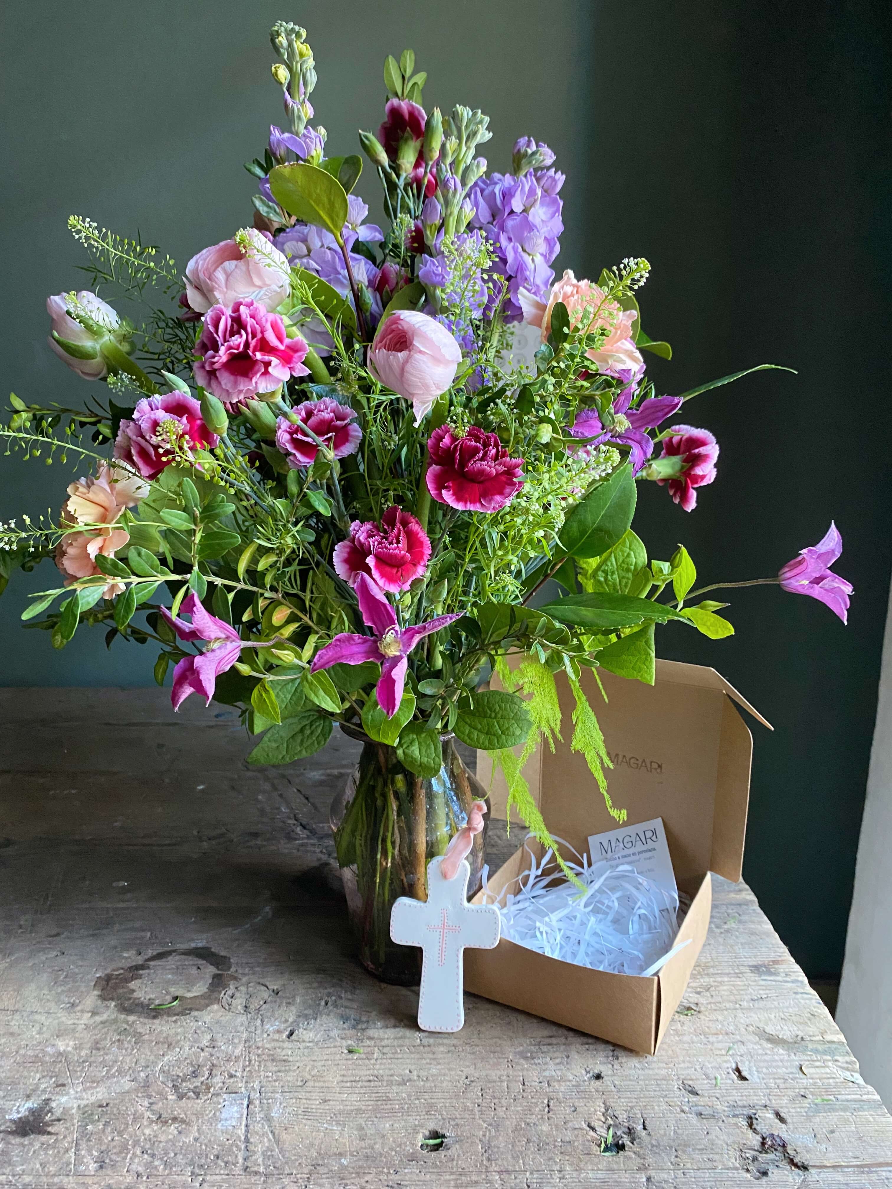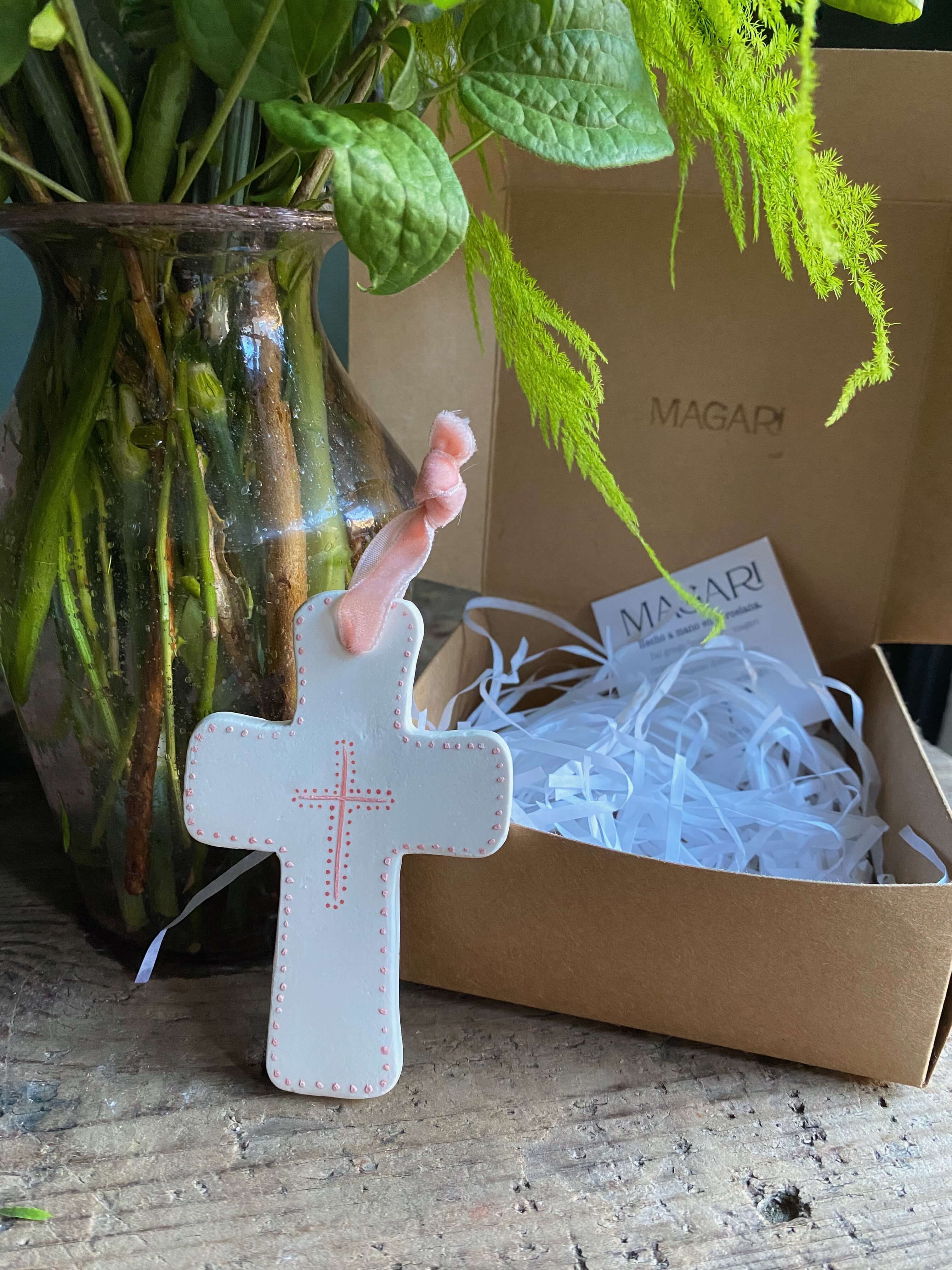 Arreglo de flores en jarrón de vidrio rosa acompañado de una Cruz para la cuna del bebé en porcelana hecha a mano de Magari.