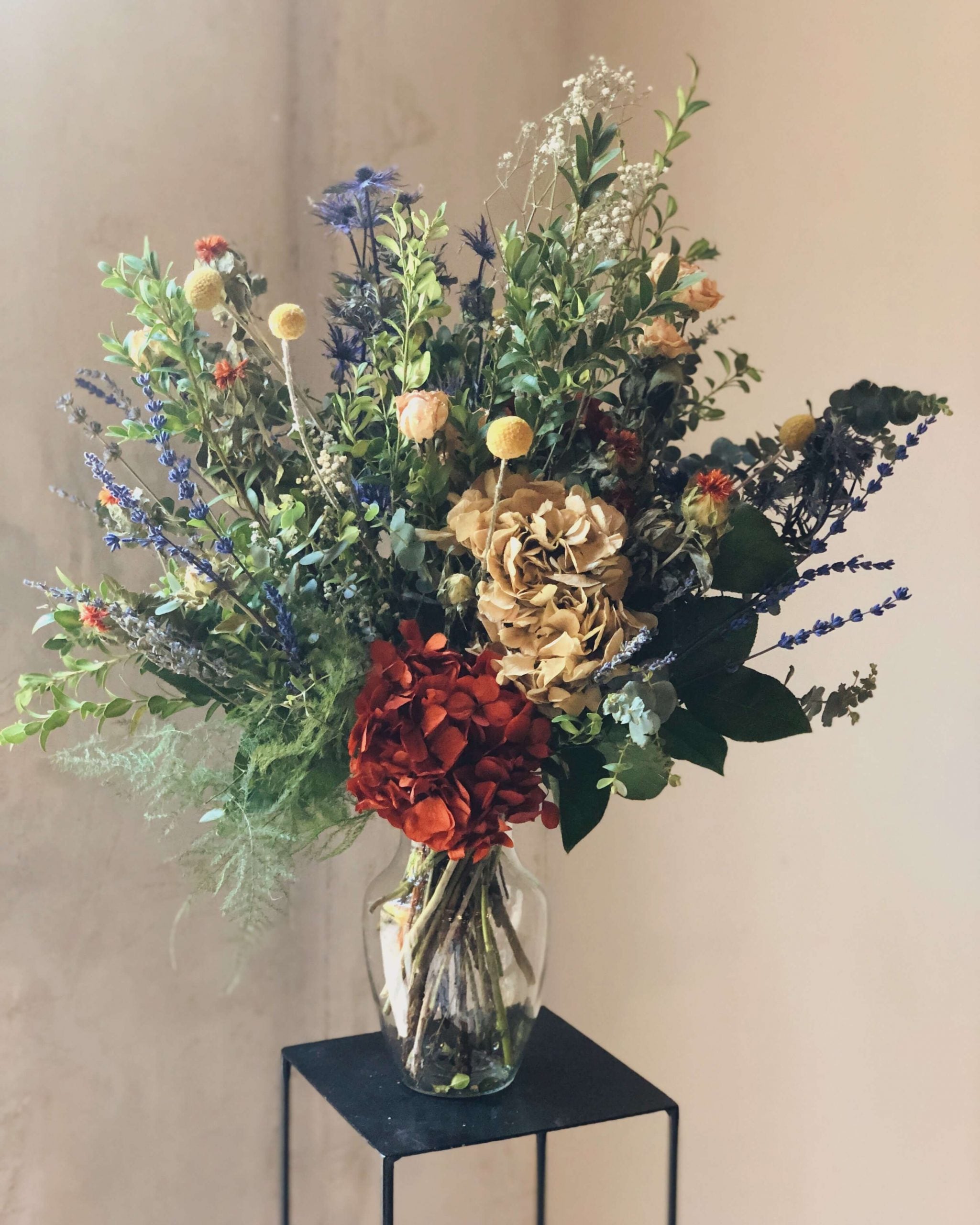 Arreglo de flores secas y preservadas tipo hortensias, rosas de pitimini, achillea, lavanda, cardo.. Esta foto es orientativa en cuanto a flores y colores.