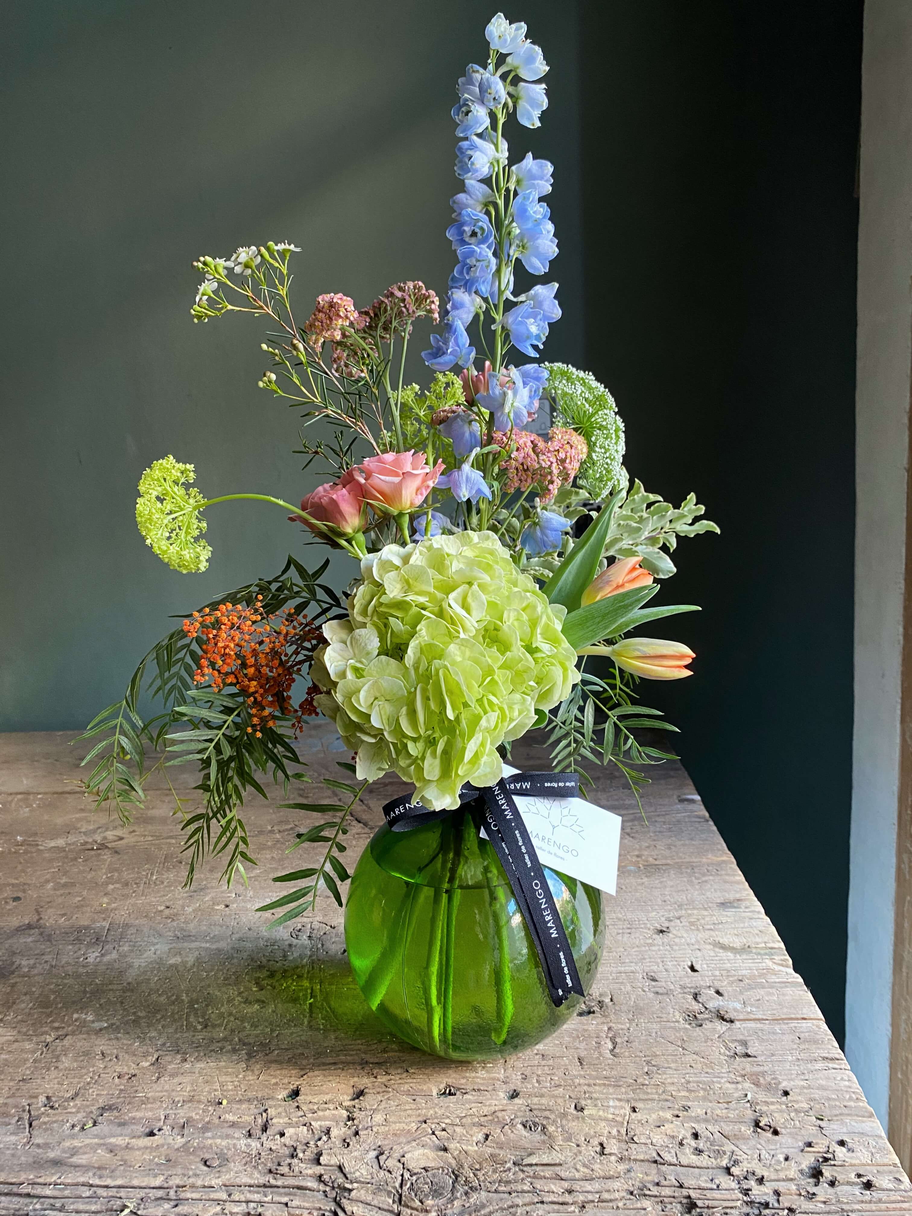 Esta foto es orientativa en cuanto a flores y color. Todos nuestro arreglos se hacen con flor de temporada y dependemos de la disponibilidad del mercado holandés del momento. Cada una de nuestras creaciones es única por lo que la foto es uno de los muchos arreglos que hemos hecho en este tipo de recipiente.