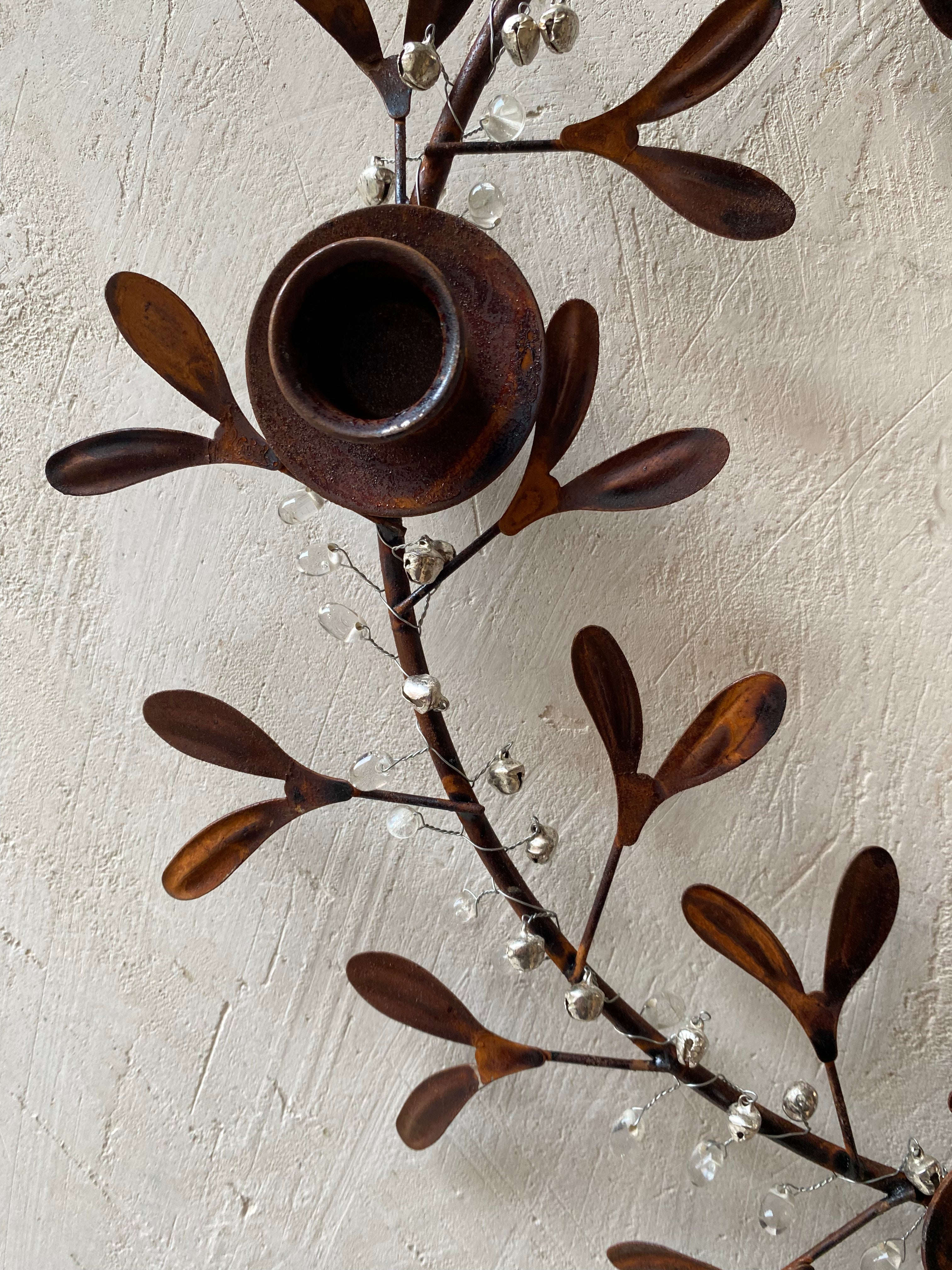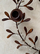 Candelabro de metal color óxido con diseño de ramas de muérdago.