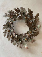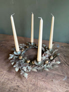 Candelabro de metal envejecido con diseño de ramas de encina y bellotas.