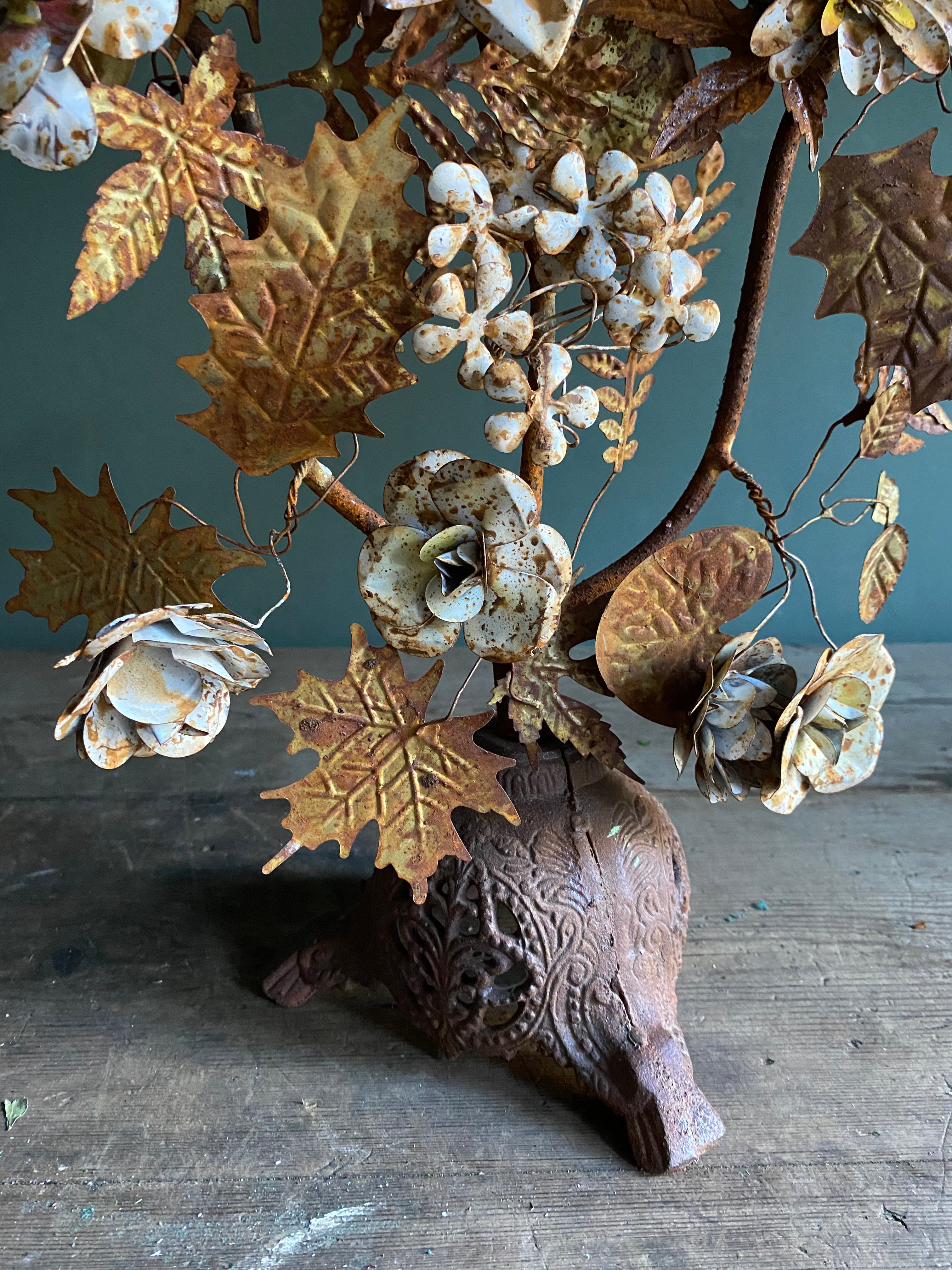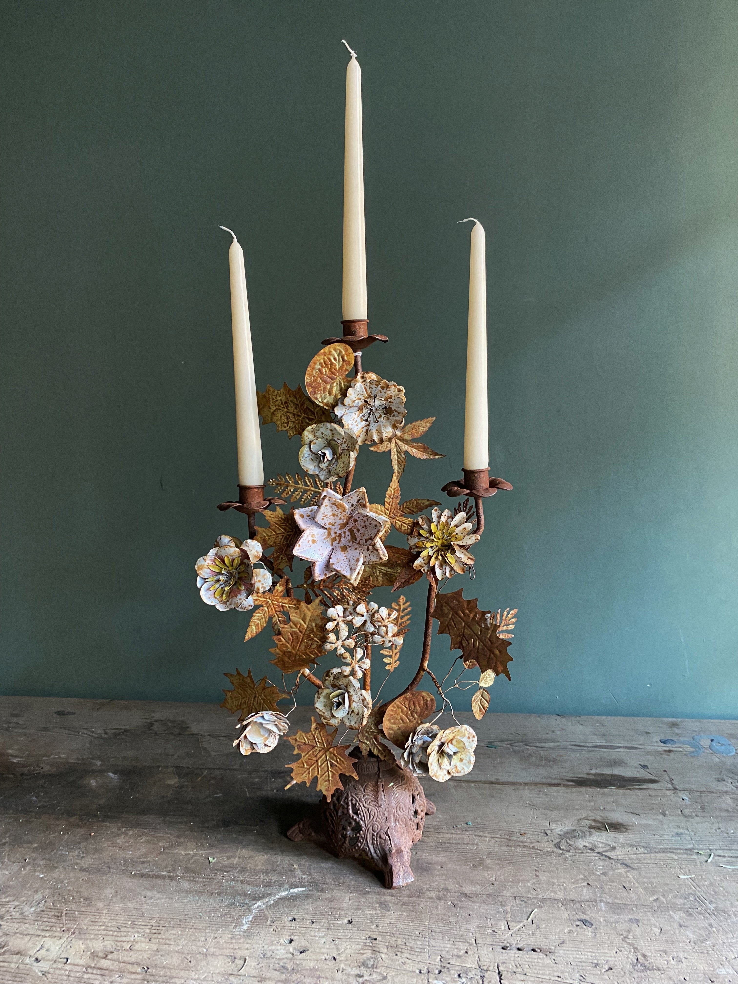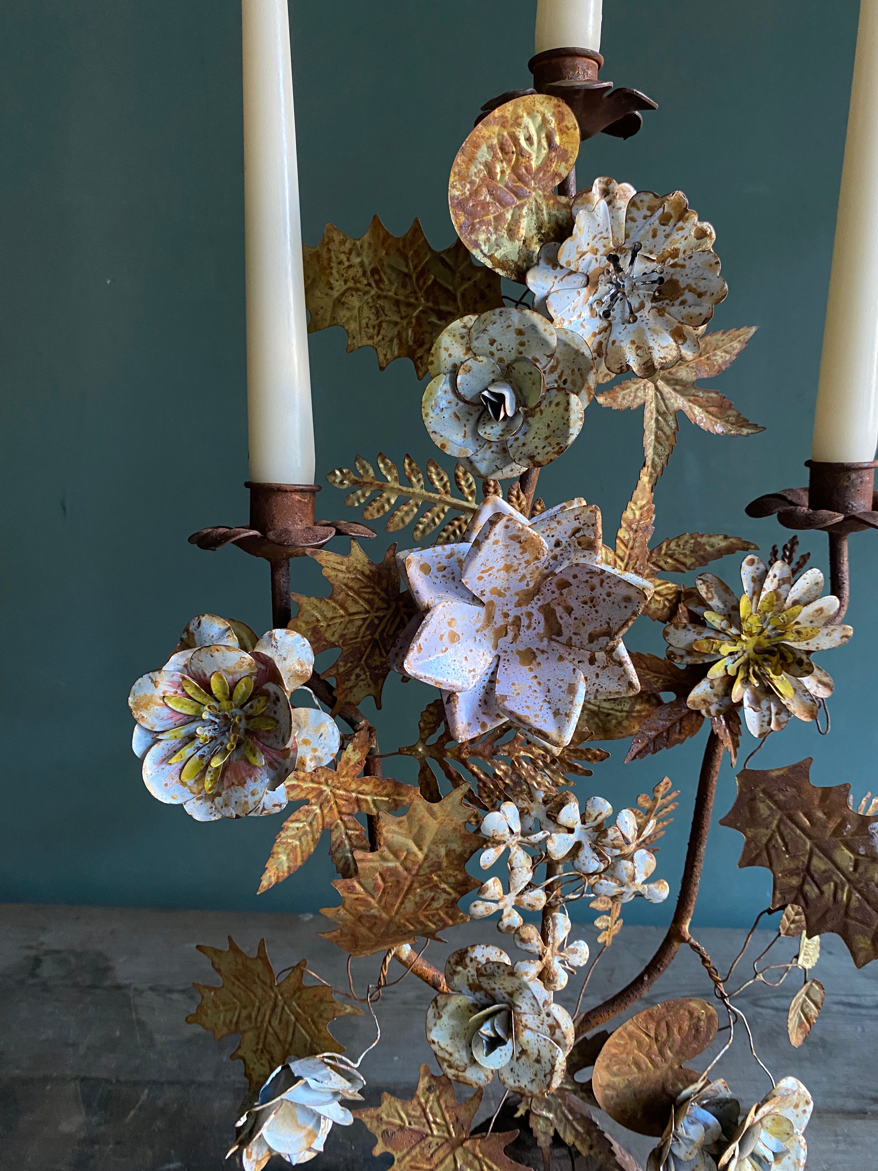 Candelabro de hierro pintado con motivos florales en tonos variados.