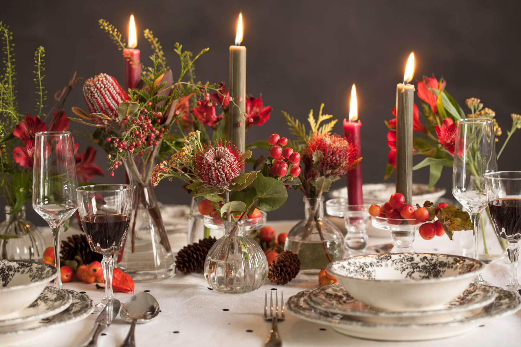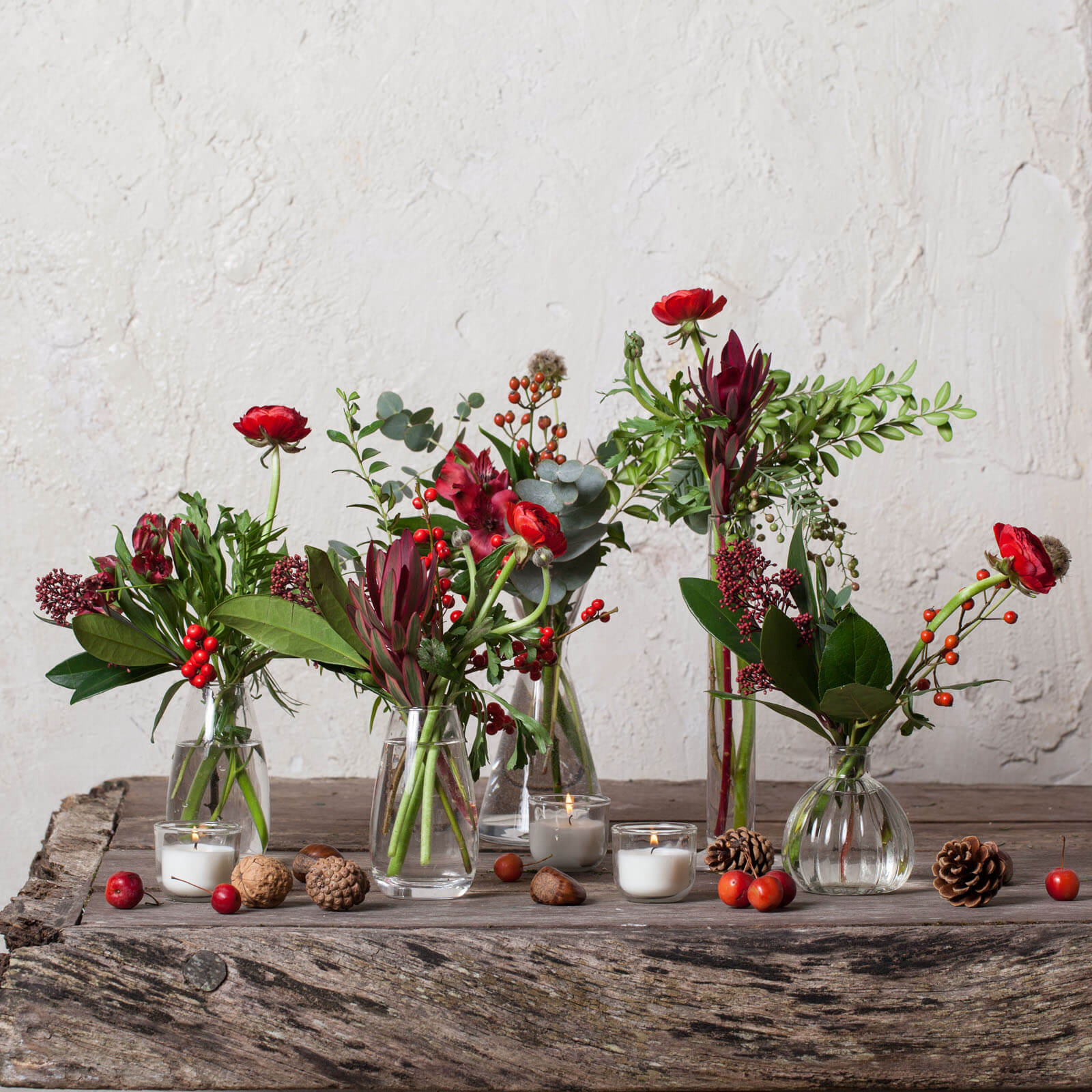 La opción más bonita y sencilla para decorar tu mesa. Centro de mesa compuesto por jarroncitos de cristal con flores de temporada. Opción de completar tu centro de mesa con velas de vasito (11 horas de quemado).