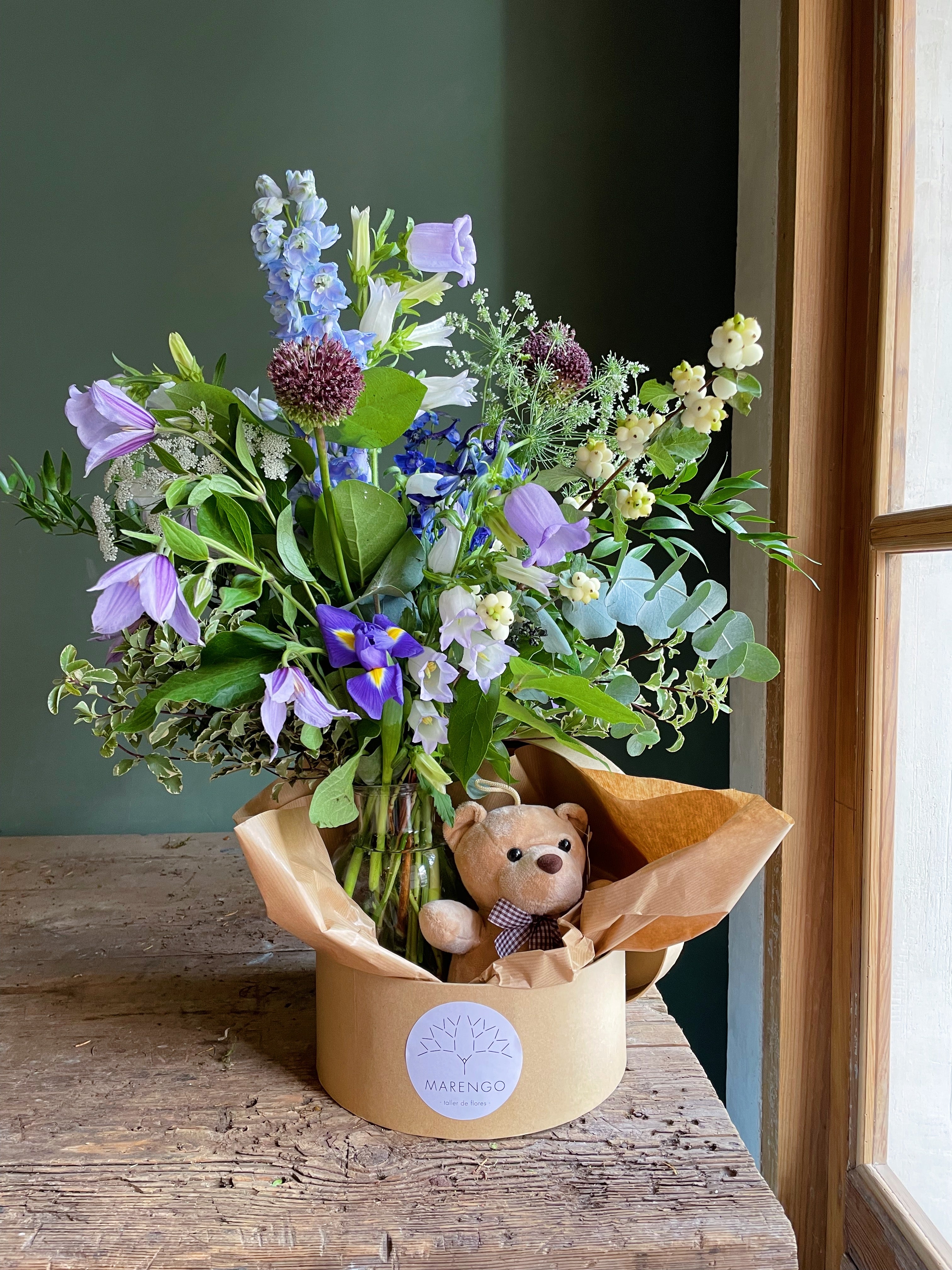 Esta foto es orientativa en cuanto a flores y color. Todos nuestro arreglos se hacen con flor de temporada y dependemos de la disponibilidad del mercado holandés del momento. Cada una de nuestras creaciones es única por lo que la foto es uno de los muchos arreglos que hemos hecho en este tipo de recipiente.
