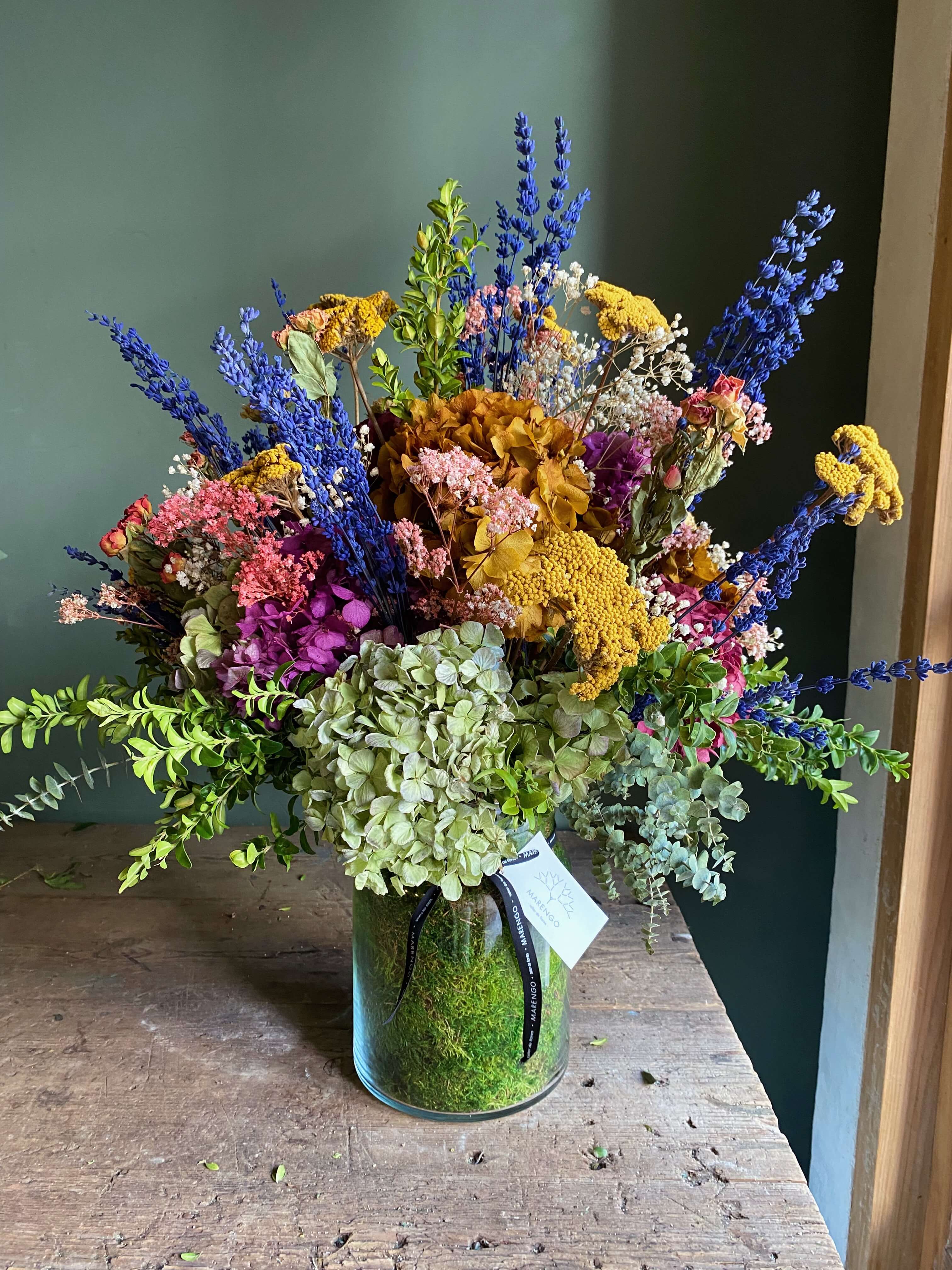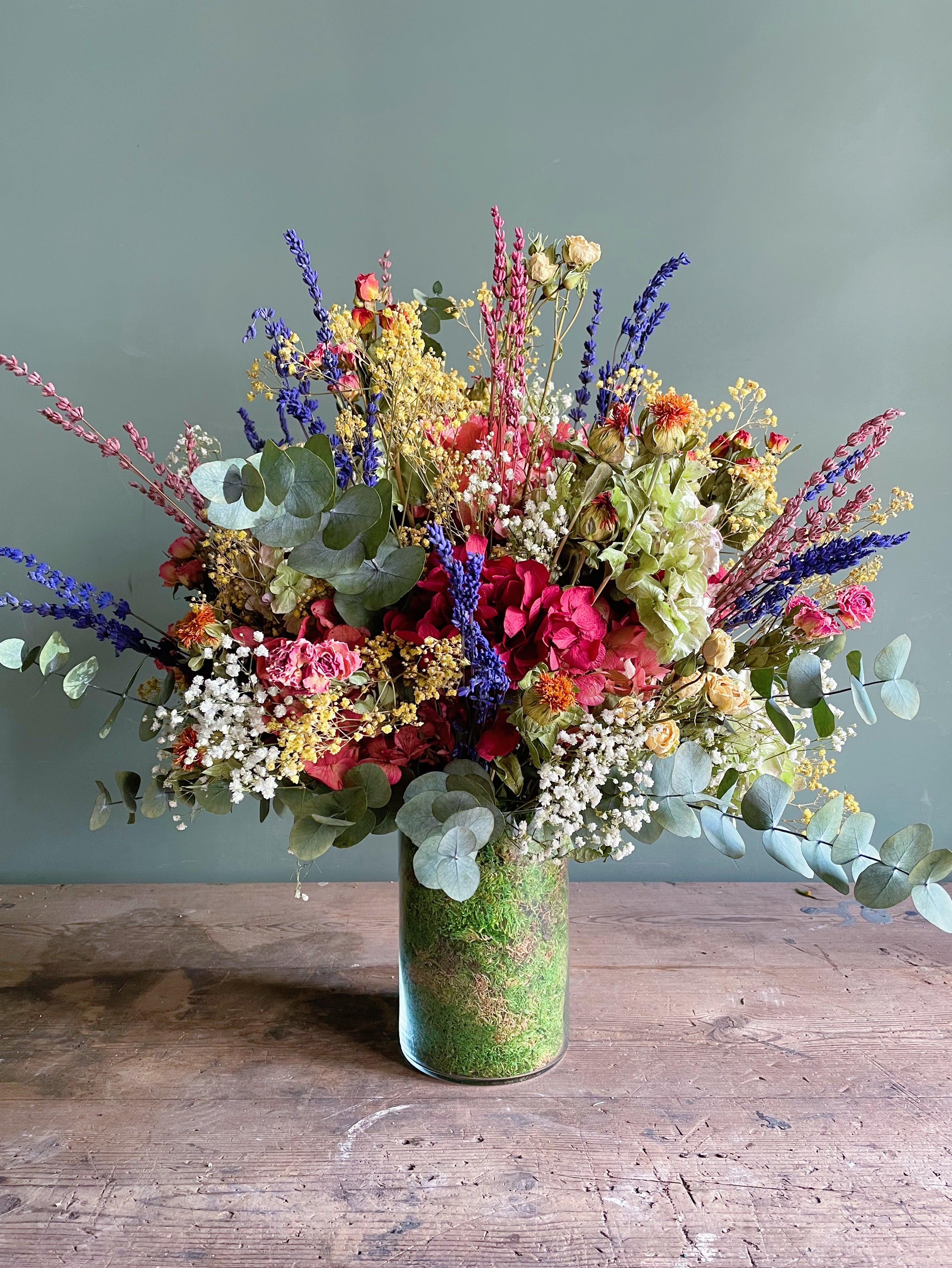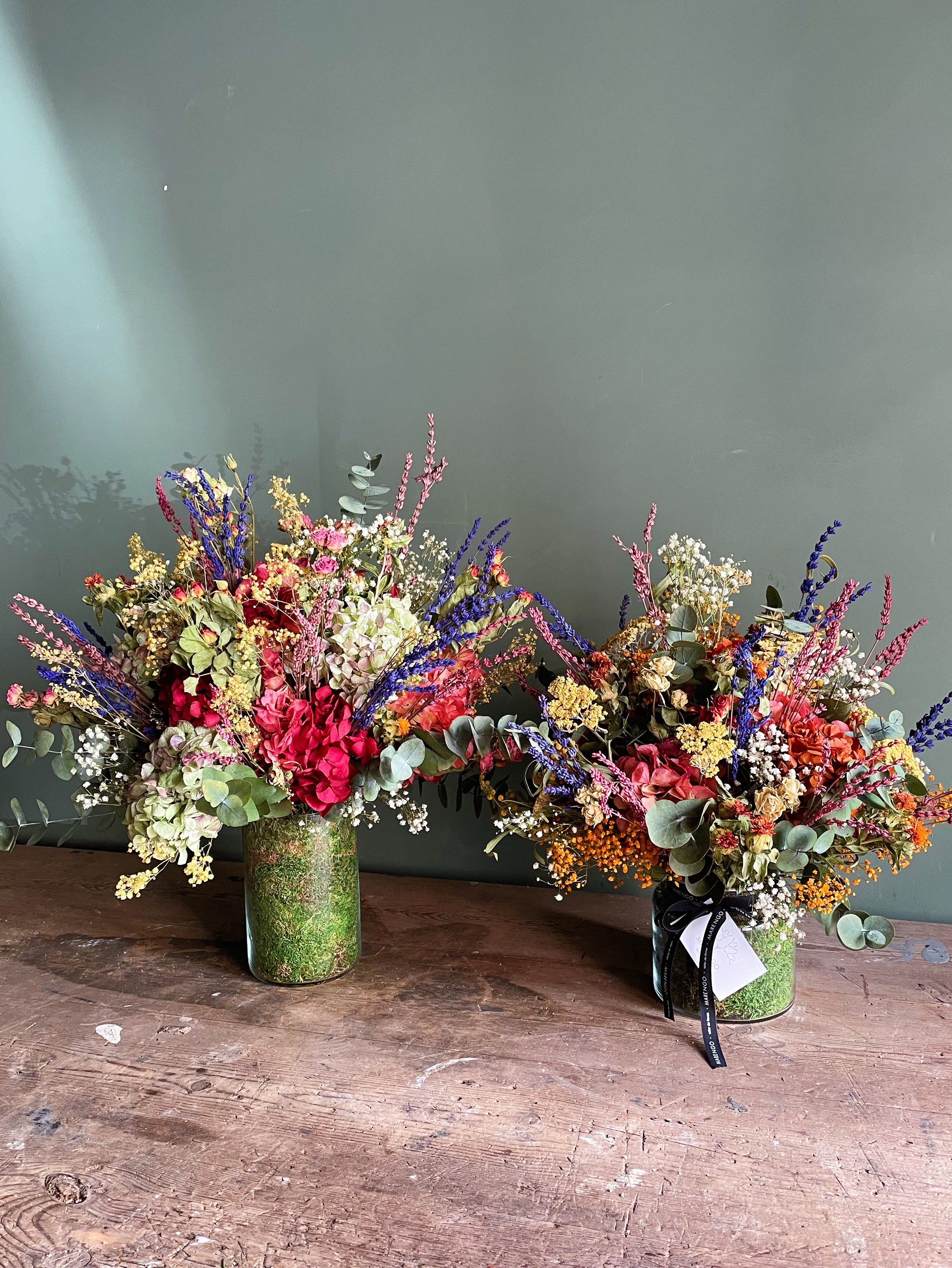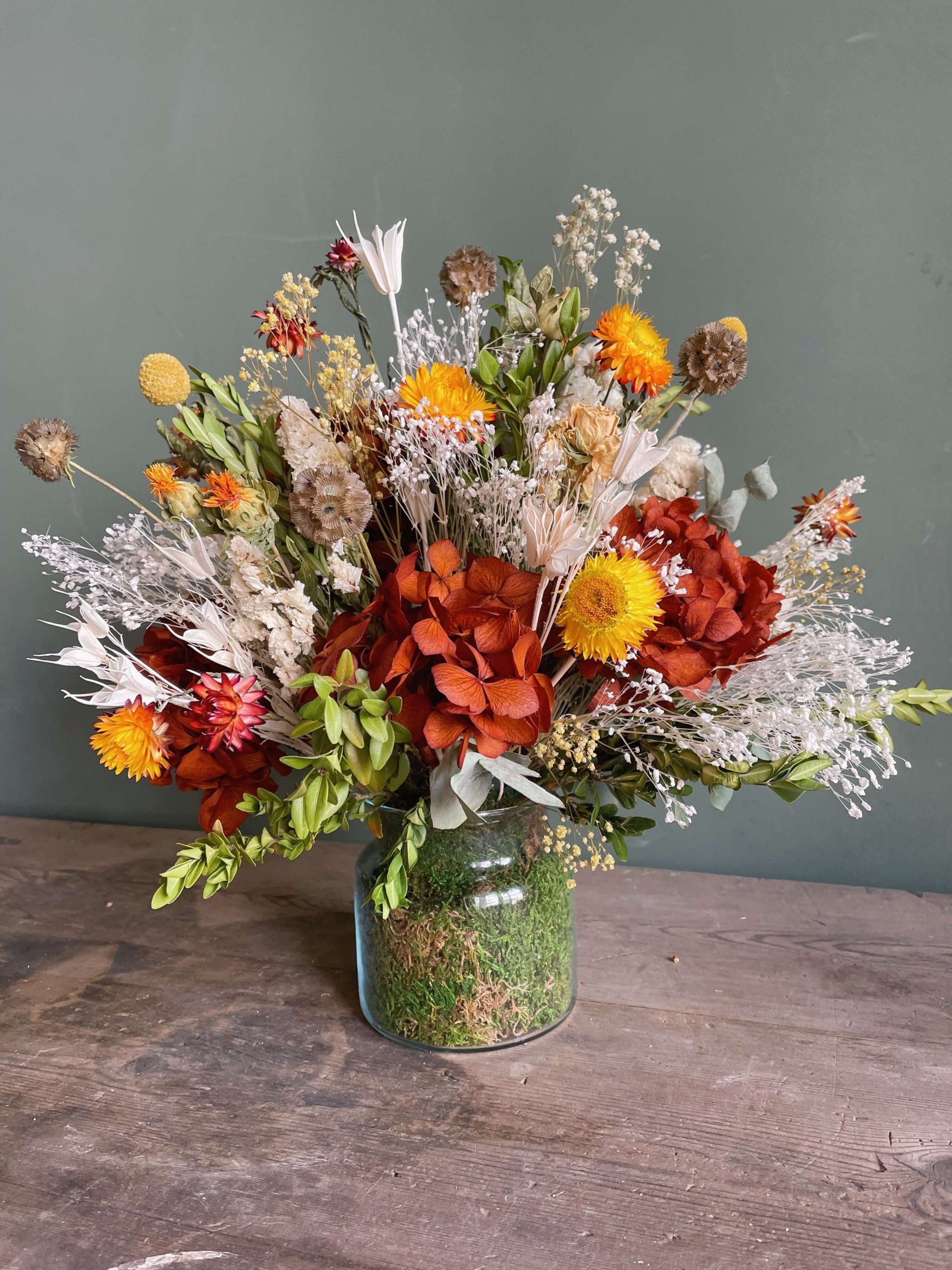 Esta foto es orientativa en cuanto a flores y color. Todos nuestro arreglos se hacen con flor de temporada y dependemos de la disponibilidad del mercado holandés del momento. Cada una de nuestras creaciones es única por lo que la foto es uno de los muchos arreglos que hemos hecho en este tipo de recipiente.