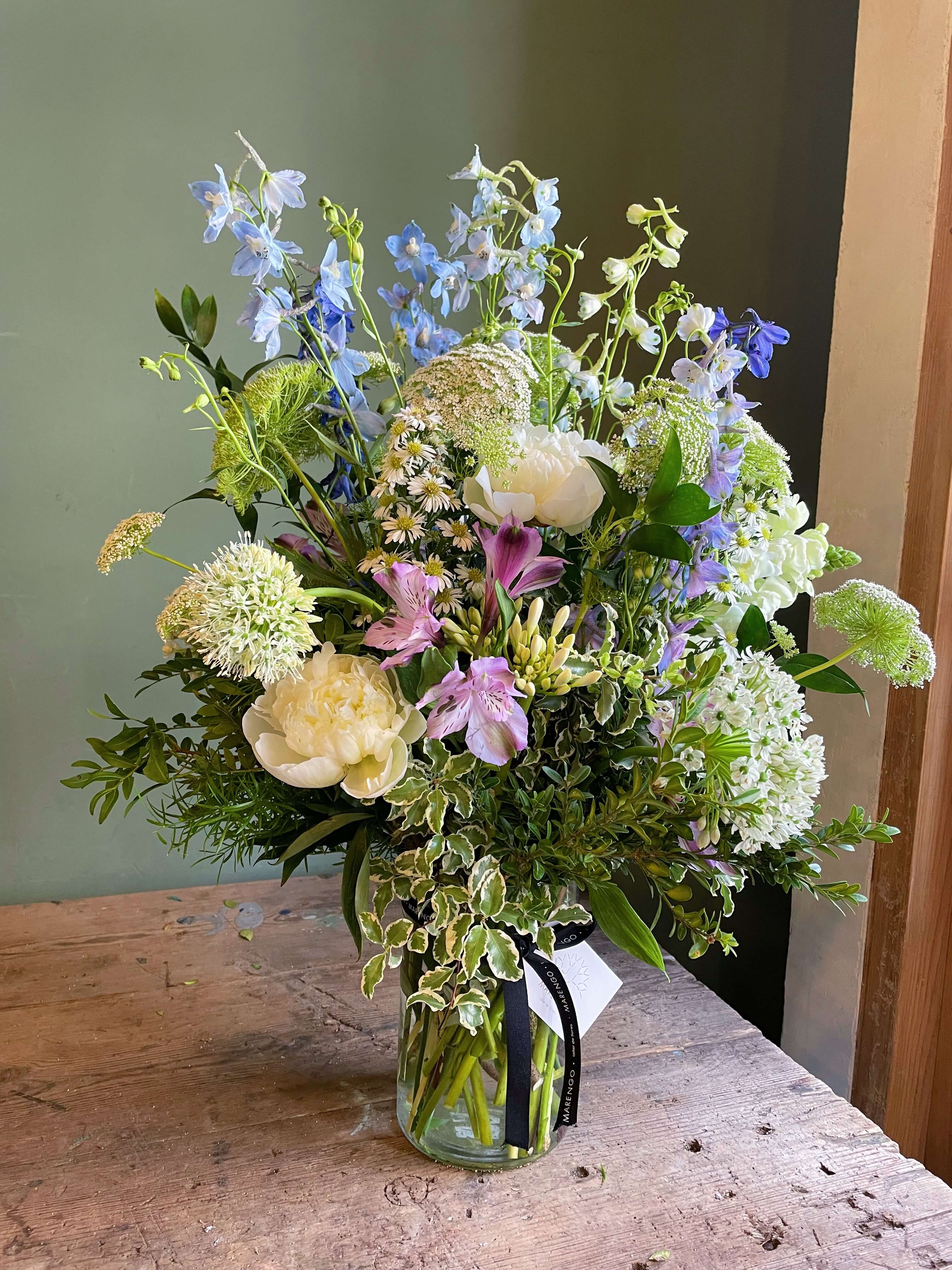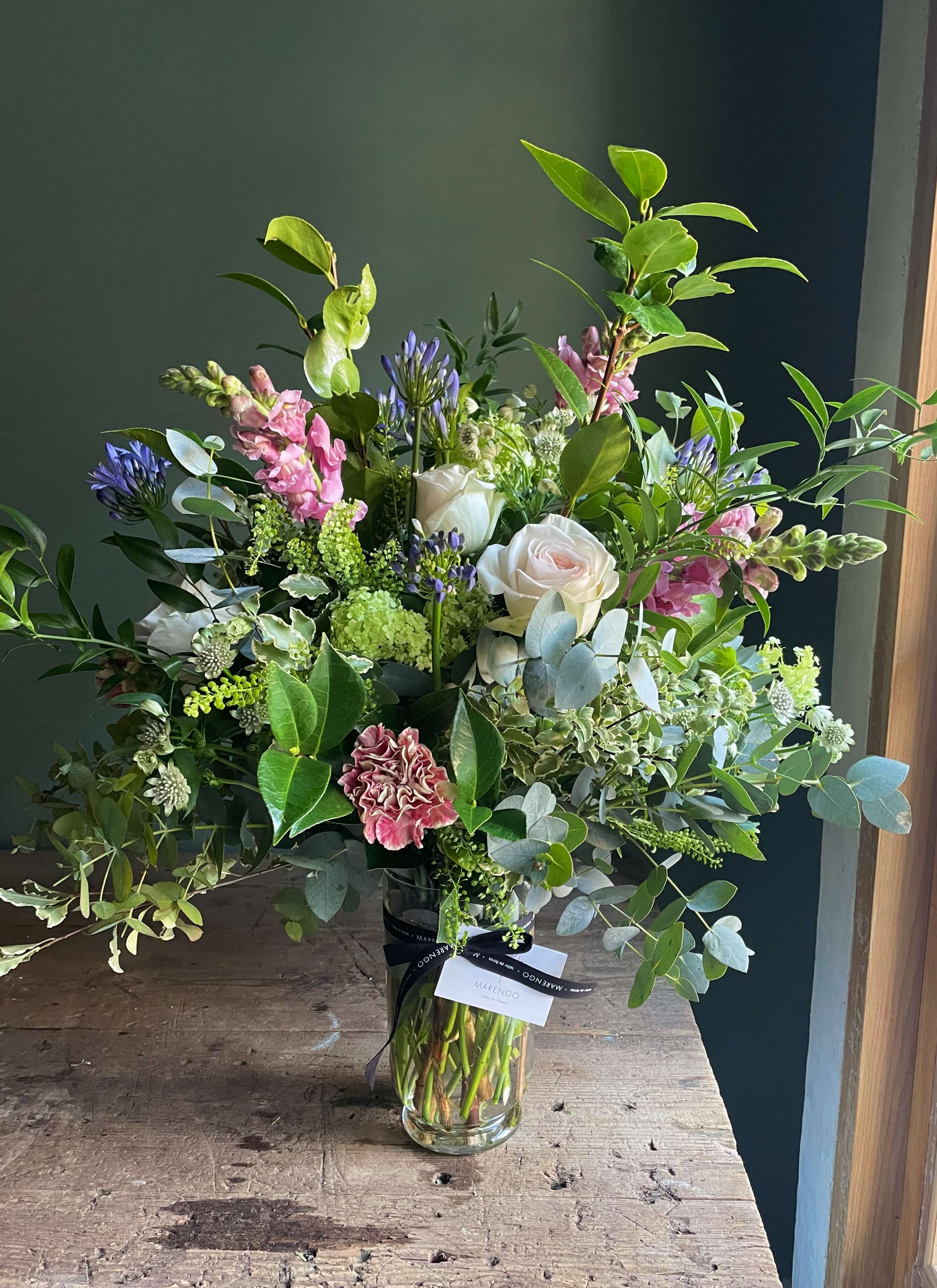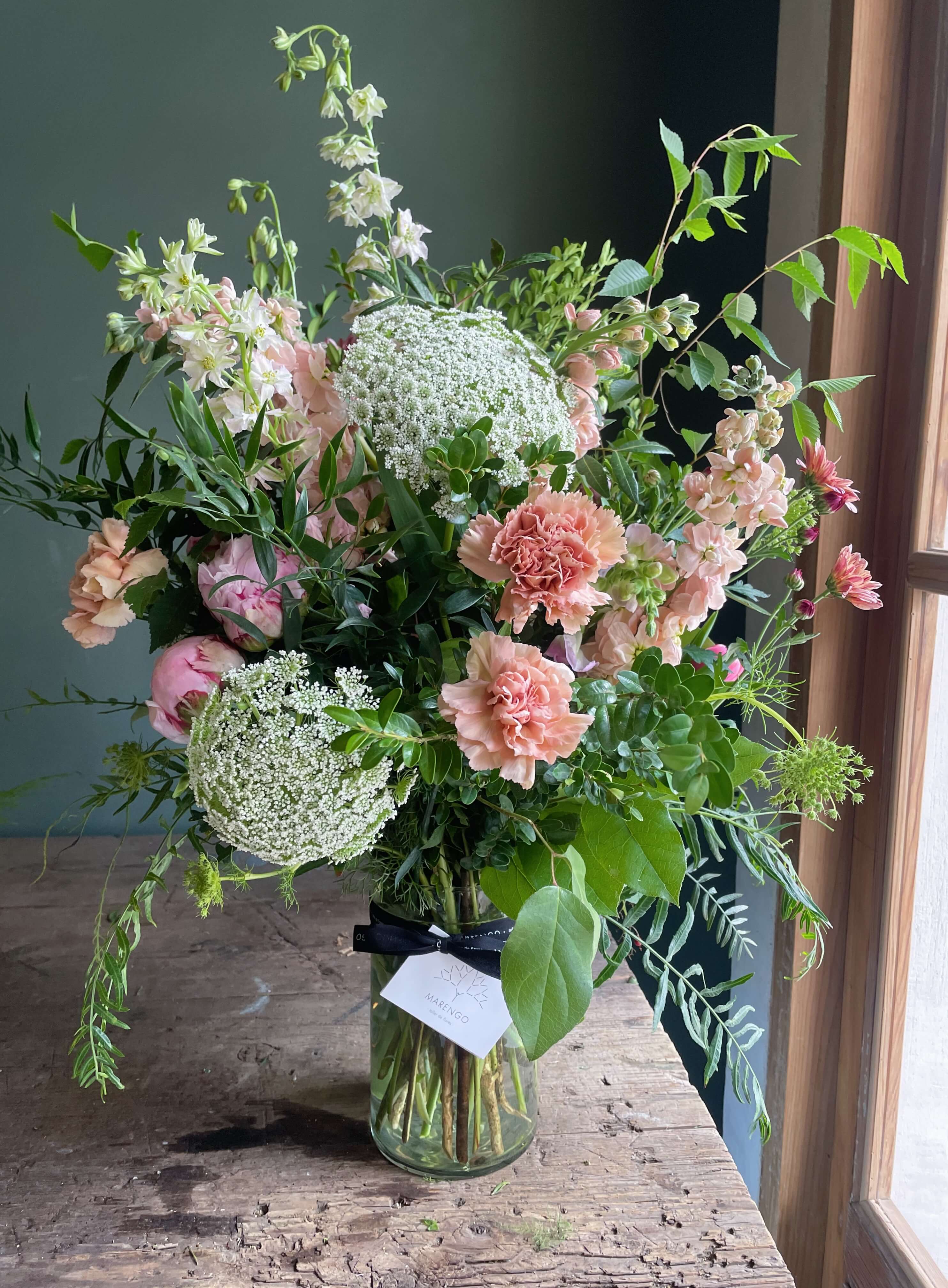 Esta foto es orientativa en cuanto a flores y color. Todos nuestro arreglos se hacen con flor de temporada y dependemos de la disponibilidad del mercado holandés del momento. Cada una de nuestras creaciones es única por lo que la foto es uno de los muchos arreglos que hemos hecho en este tipo de recipiente.