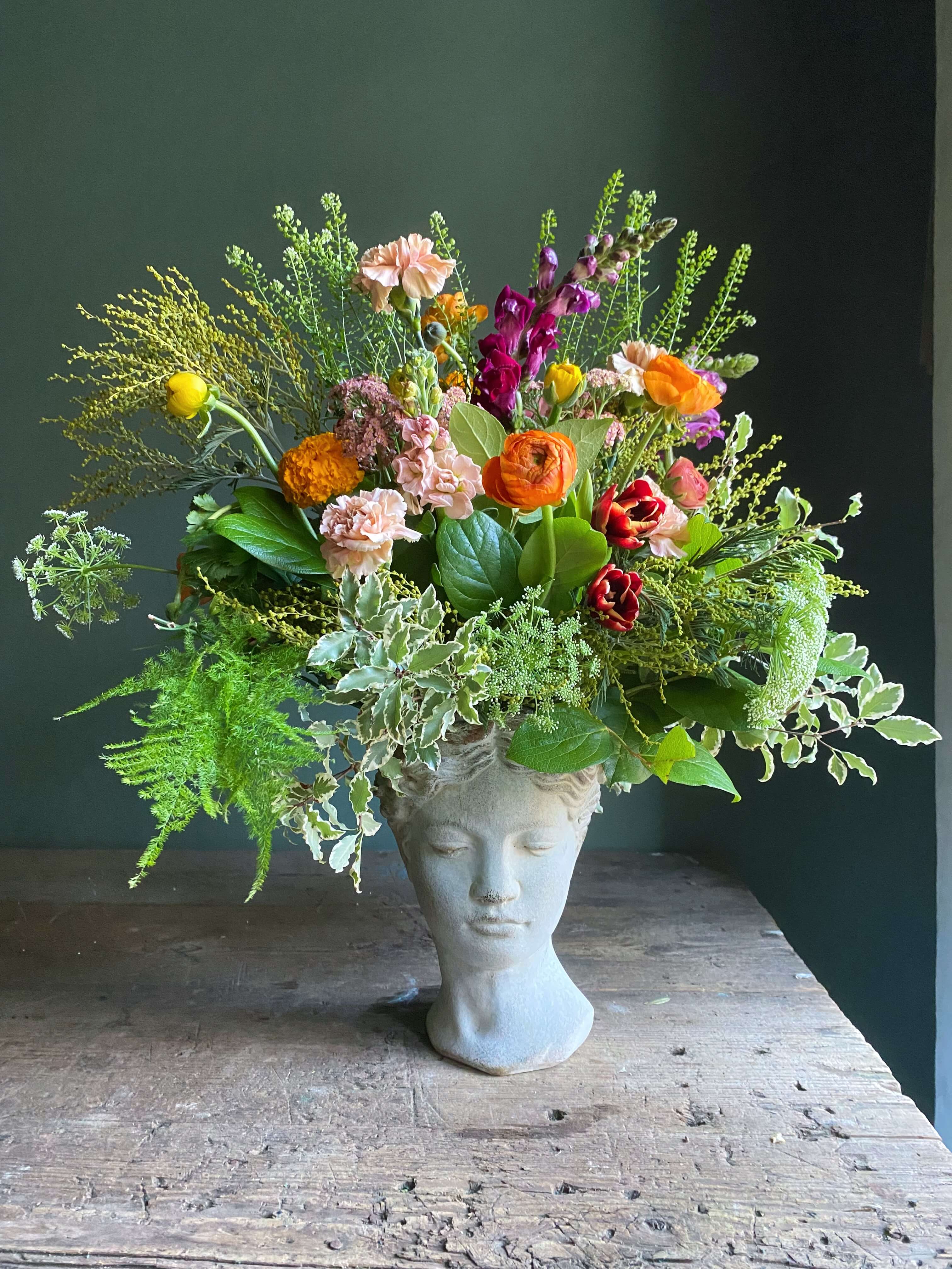 Esta foto es orientativa en cuanto a flores y color. Todos nuestro arreglos se hacen con flor de temporada y dependemos de la disponibilidad del mercado holandés del momento. Cada una de nuestras creaciones es única por lo que la foto es uno de los muchos arreglos que hemos hecho en este tipo de recipiente.